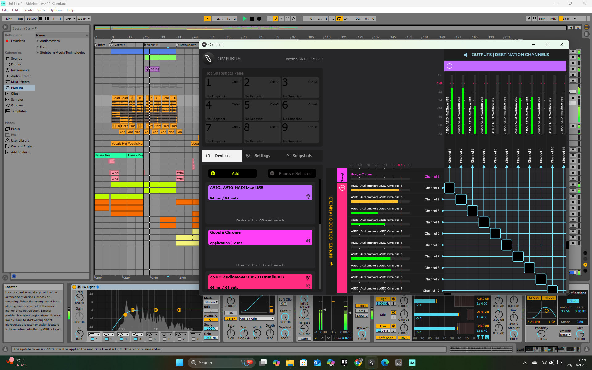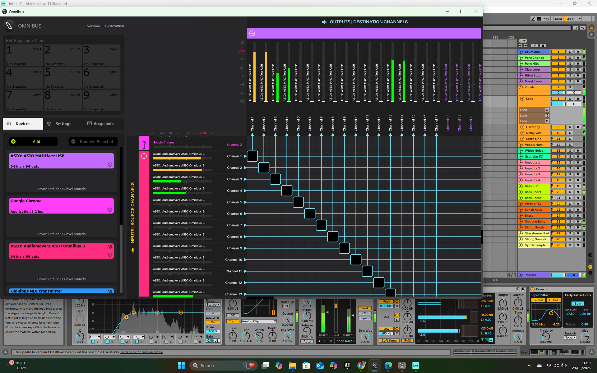 Photo caption 3: The Audiomovers OMNIBUS 3.0 for Windows GUI, shown here floating above Ableton Live, lets Windows users route audio between any app or hardware device with ease.
