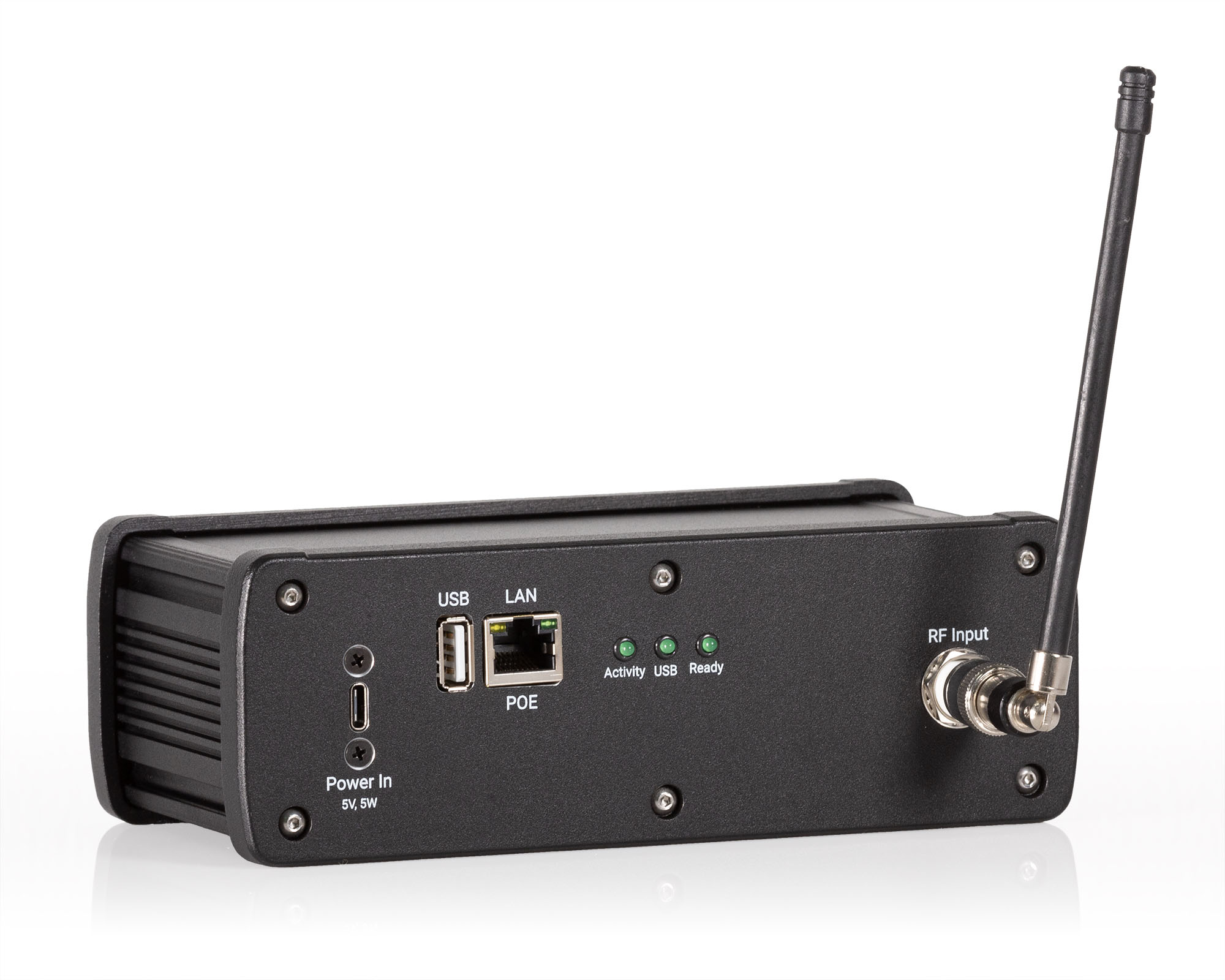 Spectrum Recorder is a compact and self-contained portable RF spectrum scanner that provides easy capture, storage and retrieval of RF spectrum data for simplified monitoring and optimization of wireless microphone and in-ear monitor systems. Spectrum Recorder is plug and play, immediately beginning RF spectrum data capture when powered up. Its ease of use by even untrained customers has proven valuable for system configuration when shipped to a client before installation, saving time, man-hours and expense – integrators no longer require personnel onsite for tedious spectrum analysis. Its 24-hour Scan Data Capture mode lets integrators capture time-stamped spectrum activity for identification of RF anomalies, helping pinpoint intermittent issues. Captured spectrum data can be retrieved remotely for evaluation. Spectrum Recorder comes with a whip antenna or can be directly connected to a wireless microphone antenna system to capture snapshots or logs of an RF environment precisely as it appears at receiver inputs.