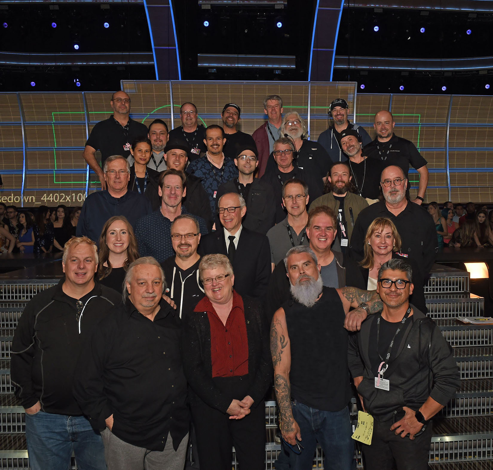 Santa Monica, Calif. (February 24, 2017) — The 59th Annual GRAMMY Awards® on Sunday, Feb. 12, 2017, held at the Staples Center in Los Angeles, showcased an amazing collection of musical performances and tributes and utilized the latest in technology to provide television viewers worldwide with a cutting-edge, high-definition/5.1 surround sound event. Only minutes before the start of the 59th Annual GRAMMY Awards, several members of the 2017 audio team gathered for a photo. Photograph courtesy of The Recording Academy®/WireImage. © 2017 Photograph by Kevin Winter
