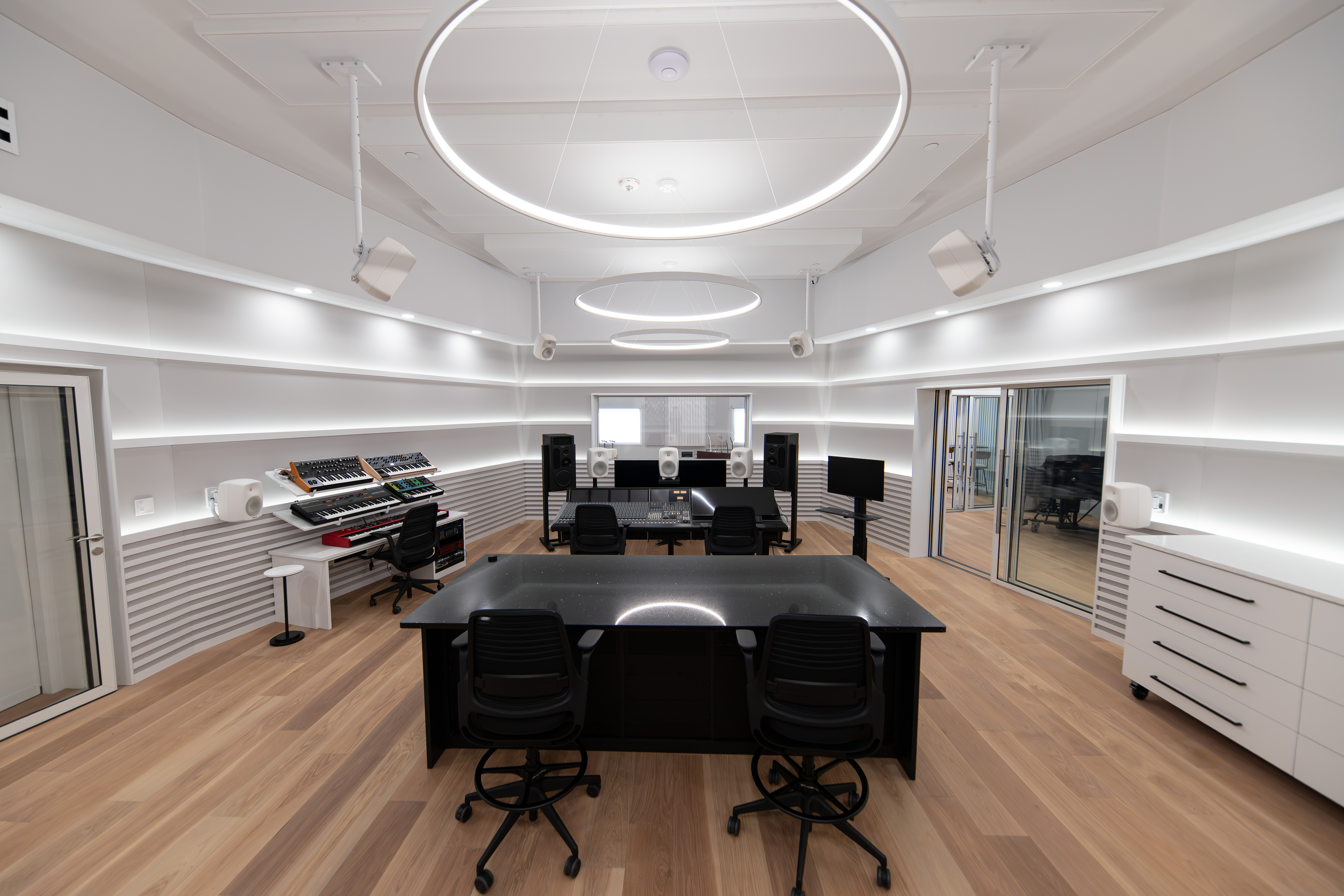 The Genelec immersive system employs 8350A monitors for L-C-R, 8340A monitors for surrounds and height channels, a 7382A subwoofer and a 9320A Reference Controller. Finished in white to complement the studio’s minimalist aesthetic, the system’s full-range monitors and a triple 15-inch subwoofer ensure the room not only sounds phenomenal but looks visually striking. “We’ve been absolutely thrilled with the Genelec system,” commented McElhenny. “From the first playback, the clear imaging, detail, and low-end extension stood out. Every guest we’ve brought through the studio has had the same ‘wow’ moment.”