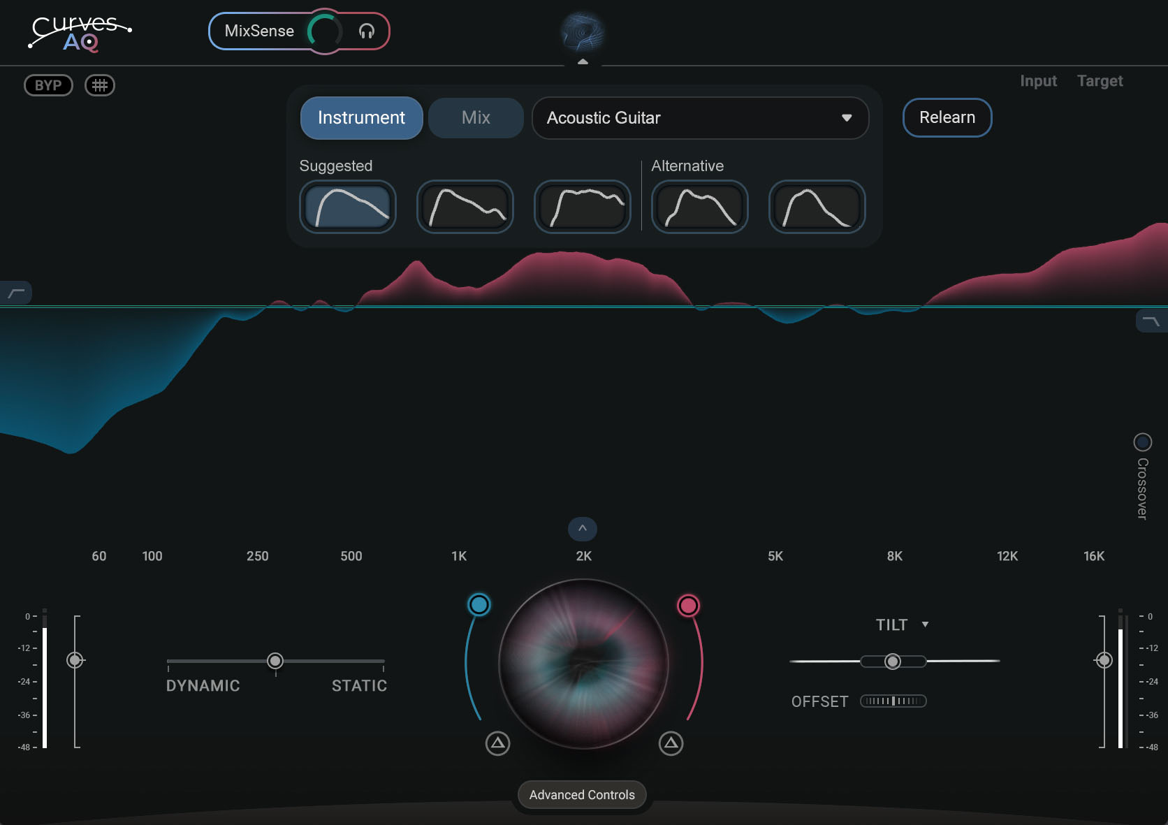 - “Smart Tilt” reshapes the spectral target with powerful tonal adjustments, while “Offset” shifts the target curve along the X-axis, repositioning the fundamental frequency and harmonics for creative effects.