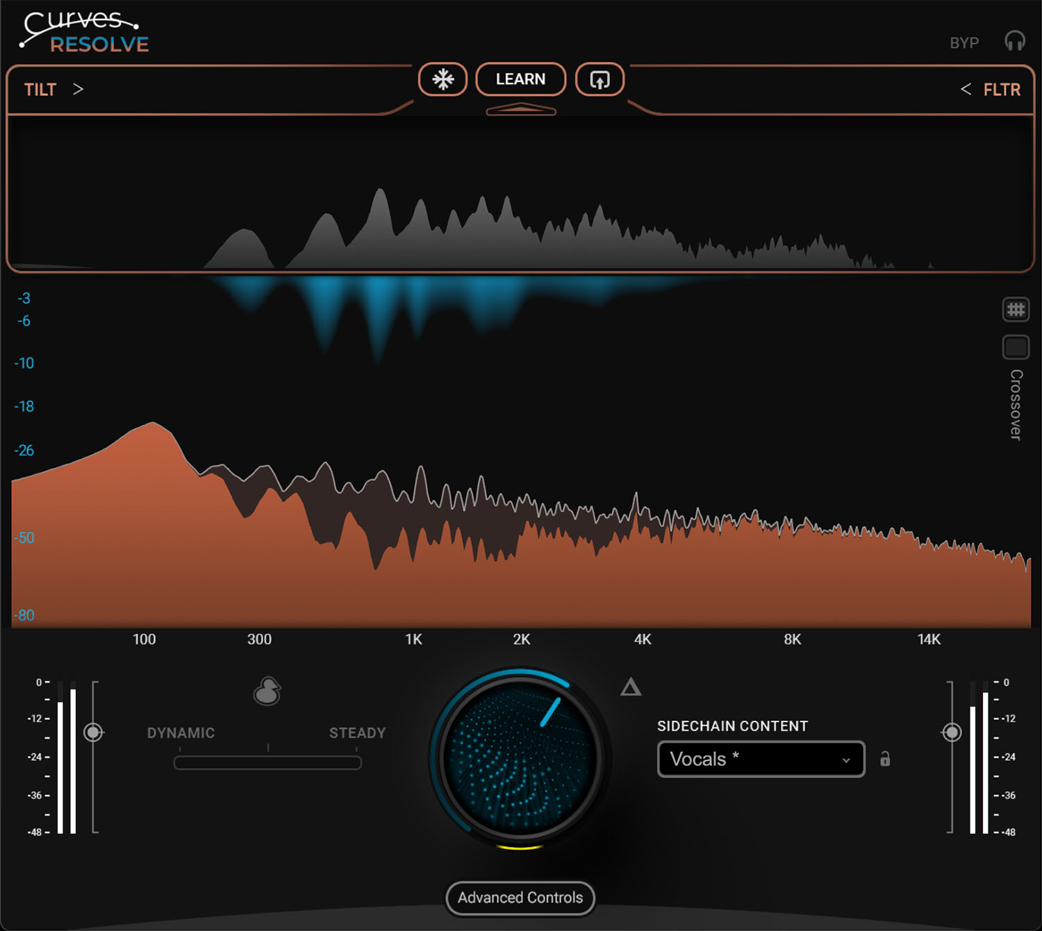 Curves Resolve is exceptionally powerful because it gives engineers two complementary ways to shape space between tracks, and even lets them combine them. In dynamic mode, the plugin reacts in real time, constantly adjusting its curves as the musical content evolves. In steady (learned) mode, it analyzes a passage and creates a stable, predictable contour that stays anchored, making it ideal for parts that need consistency. What truly sets Curves Resolve apart is the ability to blend these behaviors, offering precise control over responsiveness versus stability, a level of flexibility that simply isn’t possible with traditional EQs or static sidechain techniques.