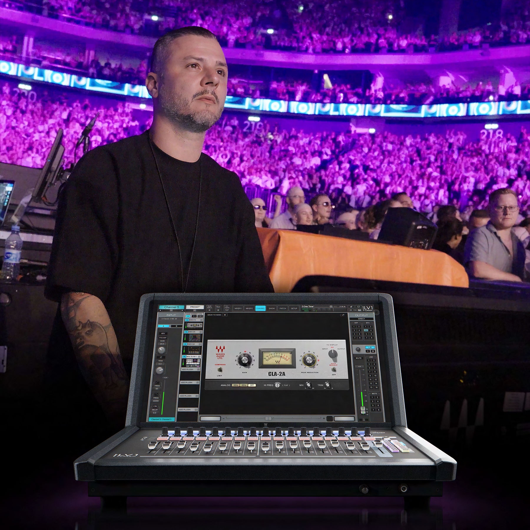 He says, “I absolutely love the LV1 Classic because it allows me to create any mix style I want without overcomplicating things—it really puts everything I need right in front of me. The interface feels natural, and having access to all the Waves plugins makes the process smoother. It runs the same plugins we use in the studio, so I can share settings with our studio engineer and keep everything aligned. That makes the workflow familiar and reliable for me. From the moment I started using this console, it felt intuitive, and I got super-comfortable using it very quickly.”
