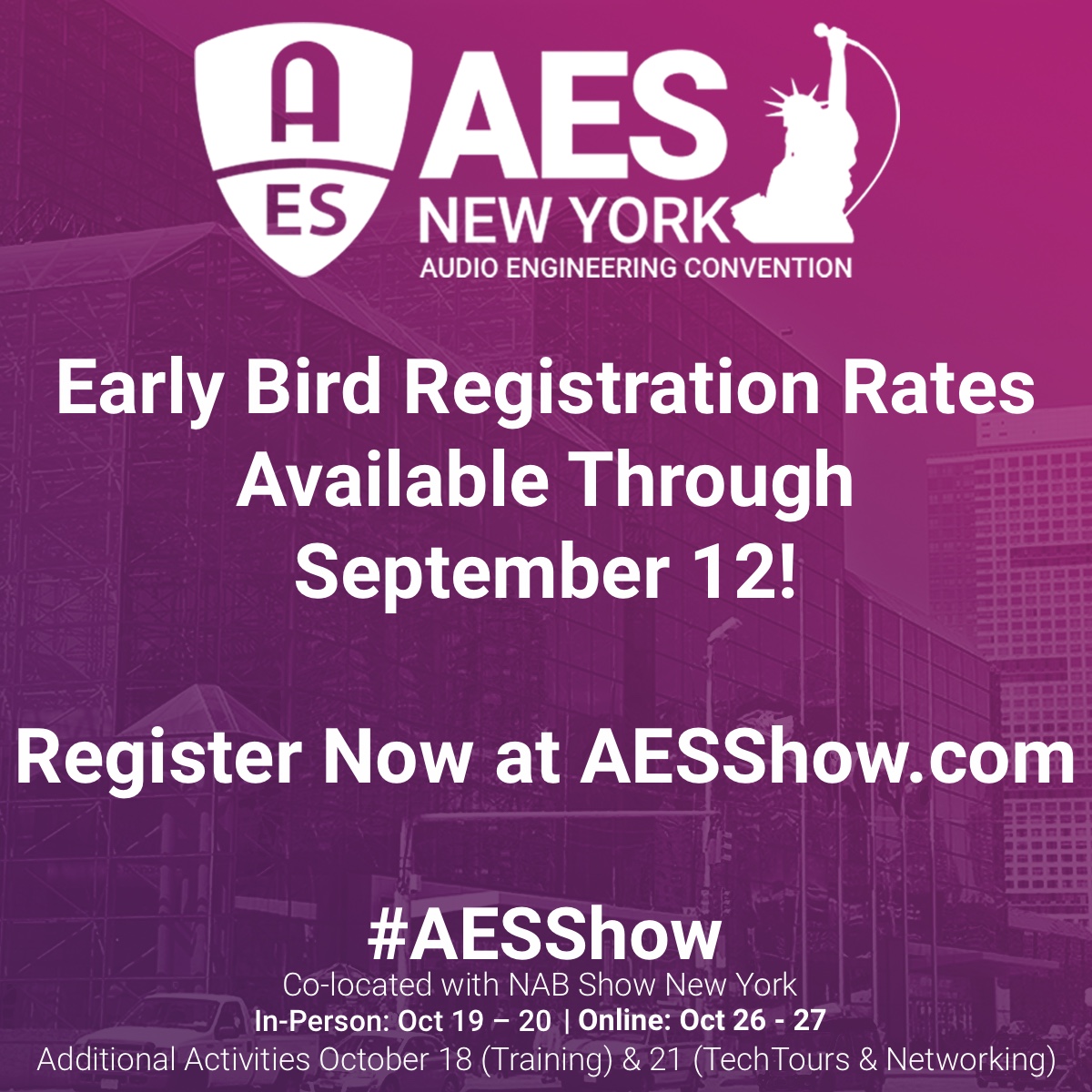 AESShow.com is the destination for program, lodging and registration information for the year’s premier professional audio experience, the AES New York 2022 Convention, with September 12 being the last chance for Early Bird free non-member Exhibits+ registration and the best rates on All Access upgrades.