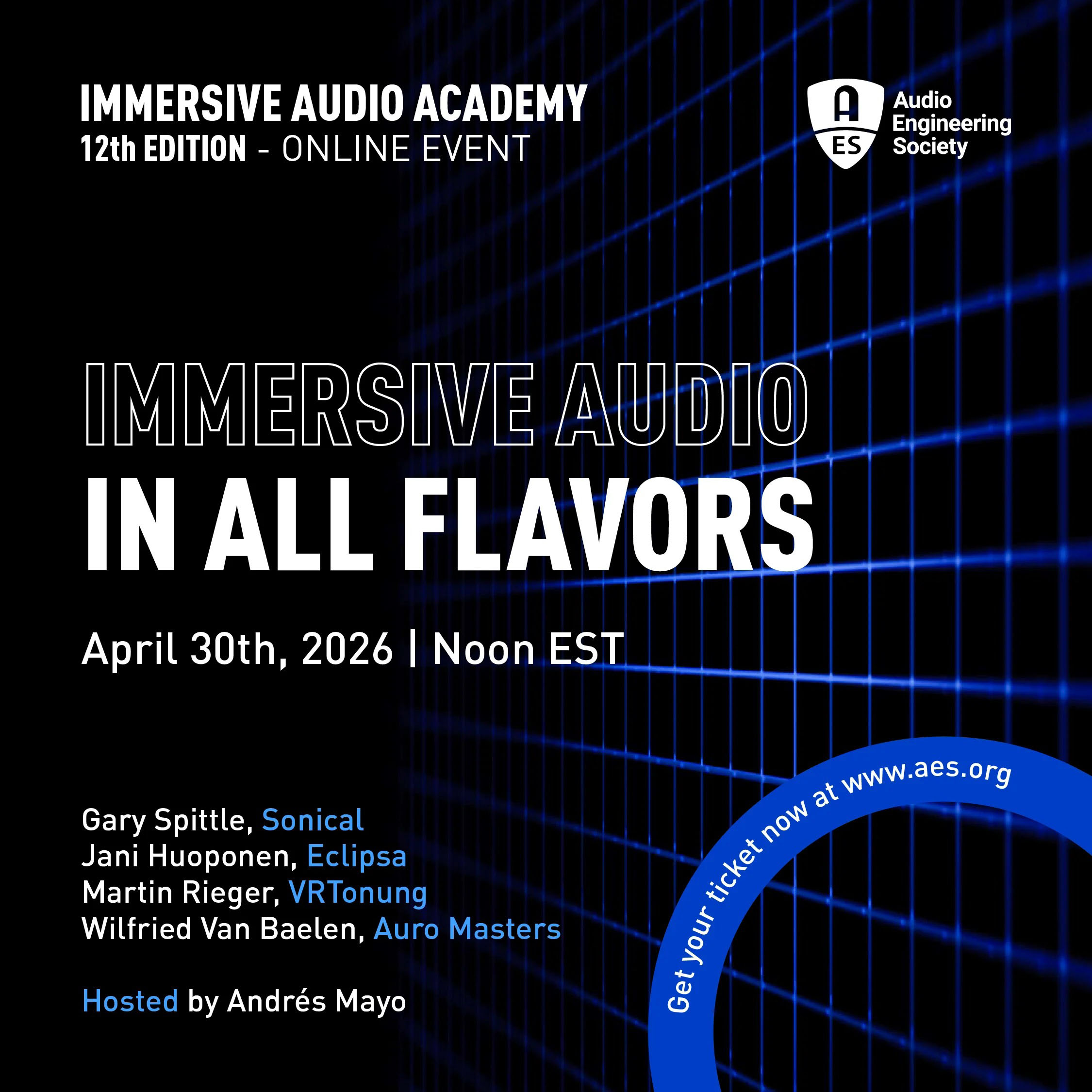New York, NY, April 23, 2026 — The Audio Engineering Society (AES) will present the Immersive Audio Academy 12th Edition – “Immersive Audio in All Flavors” on April 30, 2026, at 12:00 p.m. EDT, as part of its ongoing series examining current developments in immersive and spatial audio.