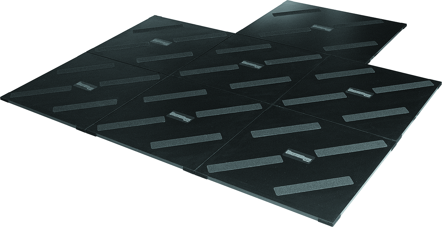 The more substantial HoverDeck’s rugged MDF laminate core and IsoPuck™ modular risers minimize structure-borne sound transmission and sympathetic vibrations between drums and hardware. The HoverDeck is available in two models; the HD-64Gig, designed for typical four and five-piece drum kits, and the HD-88Concert, configured for larger drum kits and touring applications. Both configurations utilize a set of low-profile isolating boards that assemble quickly via strategically placed hook and loop fasteners. Either model is offered with an optional rugged road case.