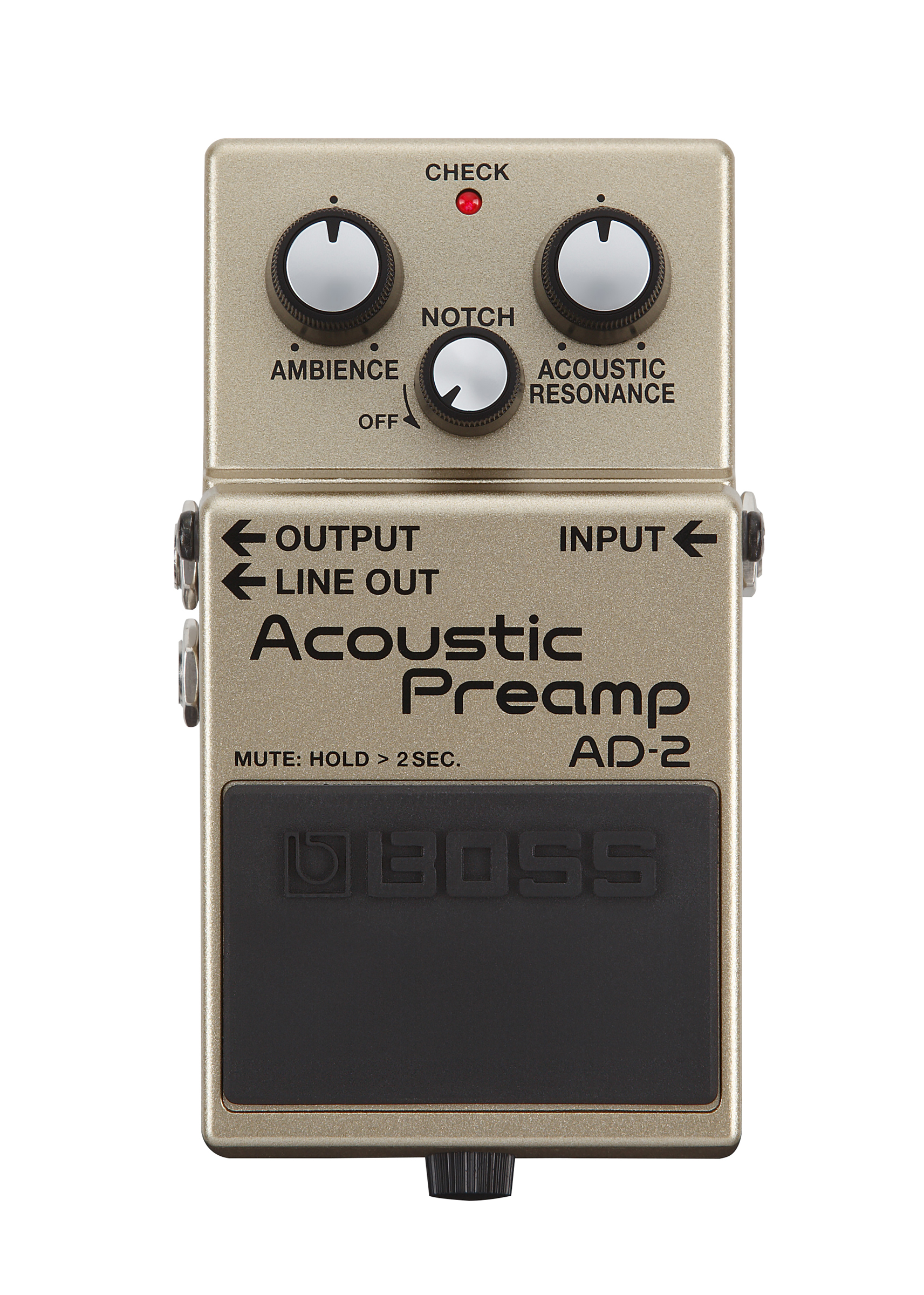 Los Angeles, CA, October 27, 2016 — BOSS announces the AD-2 Acoustic Preamp, an advanced sound processor for performing live with acoustic-electric guitars. Housed in the familiar compact pedal chassis, the AD-2 features an Acoustic Resonance effect that recreates the complex tonal characteristics of an unplugged acoustic, plus a high-quality reverb optimized for acoustic guitar performance. The pedal also includes stage essentials like a notch filter for feedback reduction, a balanced DI output, and more.
