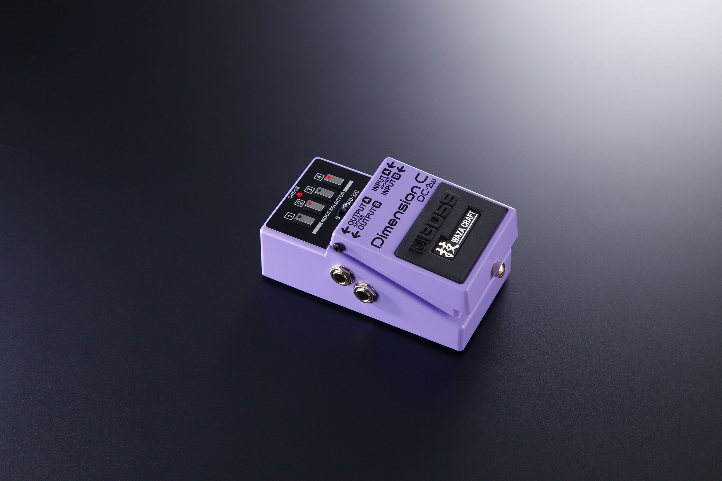 DC-2W users can choose between DC-2 and SDD-320 modes with a panel switch. The pedal provides the same intuitive four-button preset interface found on the original effects, now evolved with electronic switching that unlocks sonic variations not available on the vintage units. Across the DC-2W’s two effect modes, 20 different Dimension variations are possible with just four switches.