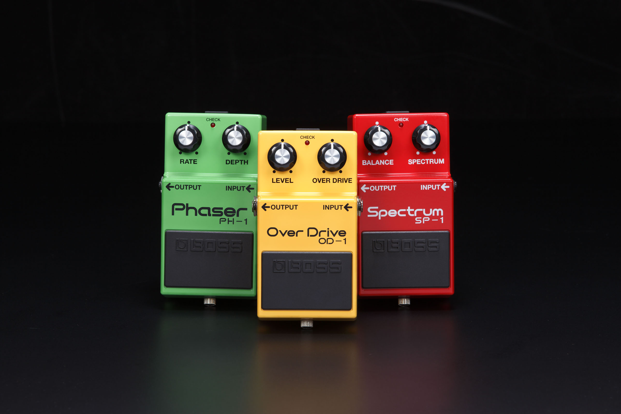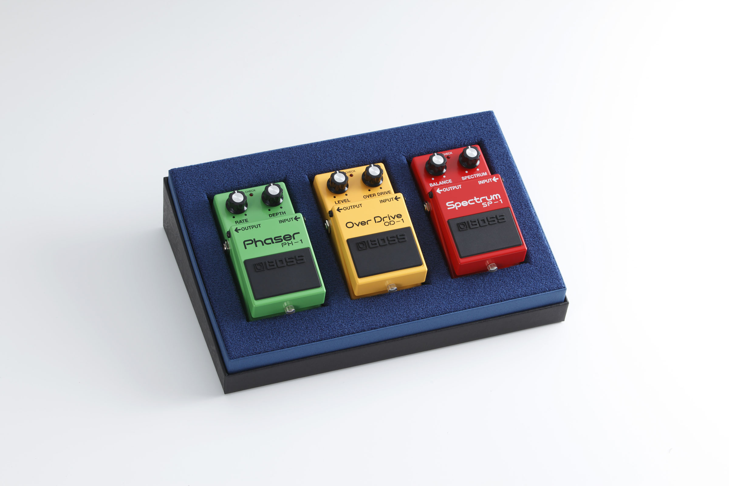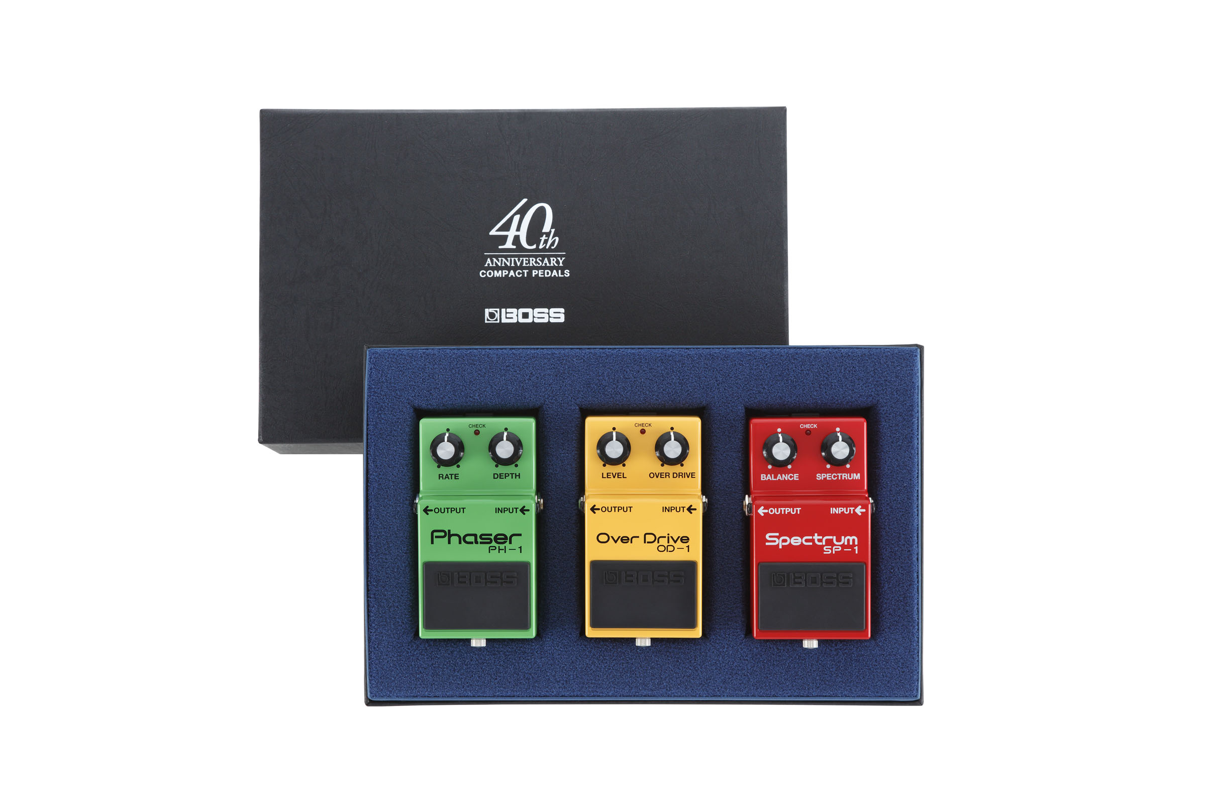 Summer NAMM Show, Nashville, TN, July 11, 2017 — BOSS (Booth 723) has announced the Compact Pedal 40th Anniversary Box Set, a special limited-edition commemorative package. The set features one-time-only reissues of the OD-1 Overdrive, PH-1 Phaser, and SP-1 Spectrum – the original three BOSS compact pedal models. Each pedal set is made in Japan and comes in a deluxe presentation box with a serial number, the BOSS 40th Anniversary logo, and a personal message from BOSS President Yoshihiro Ikegami.