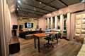 The Fly By West tracking room's multi-angled twenty-foot high knotty pine, tongue-in-groove ceilings are shared with a multi-purpose loft that is reached via a wrought iron spiral staircase. The loft area can be used by out-of-town clients for stay-over projects and offers great acoustic variety when tracking. The uniquely positioned overdub booths at the control room's rear attest to West's preferred M.O.