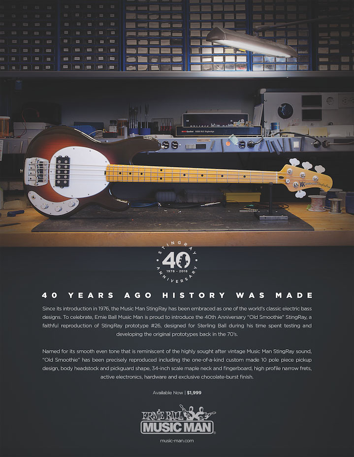 Photo caption 2: Ernie Ball Music Man “Old Smoothie” 40th Anniversary StingRay electric bass promotional graphic