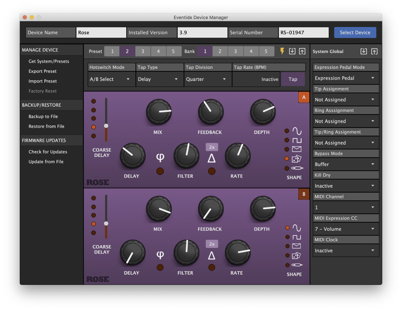Replacing the Eventide Direct software updater for its pedal line, the new Eventide Device Manager (EDM) performs software updates for all Eventide pedals. EDM also provides setting and preset management for the Rose pedal (a feature not previously available using Eventide’s remote control app H9 Control), allowing backup and restore of the entire device state. EDM provides direct access to all functionality of the Rose pedal, demystifying the plethora of available features with the ability to continuously send changes to the pedal to facilitate auditioning and experimentation with different sounds. With EDM, presets can be edited and saved on the fly and backed up and loaded with ease.