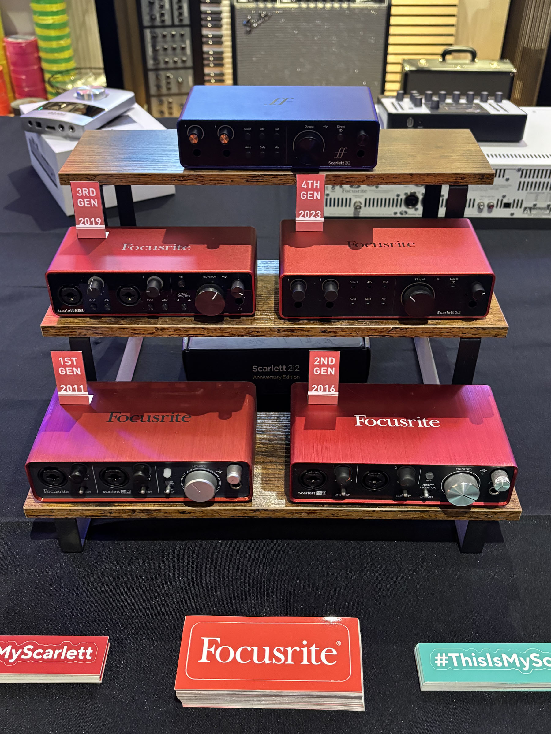 Photo caption 3: A selection of historic Focusrite Scarlett interfaces on display at the 40th anniversary celebration at Custom House at Guitar Center in Nashville’s studio-centric Berry Hill district on Thursday, September 25.