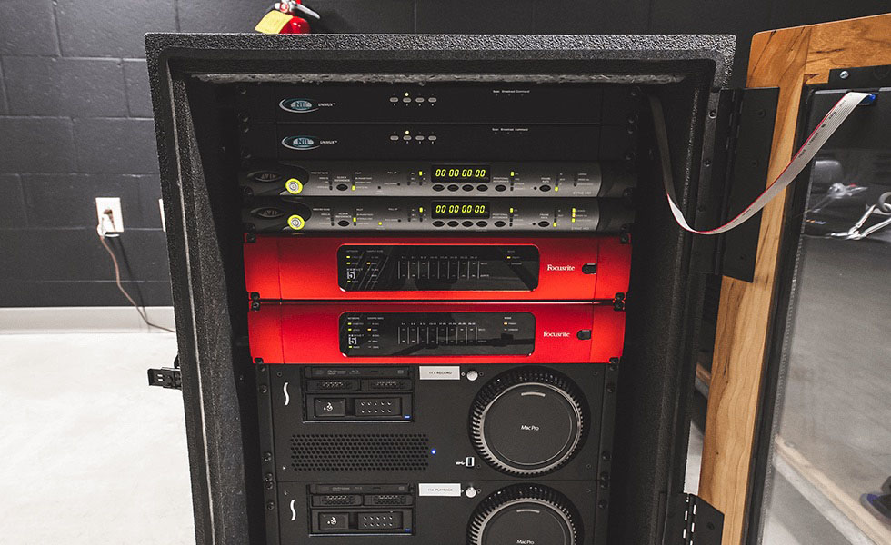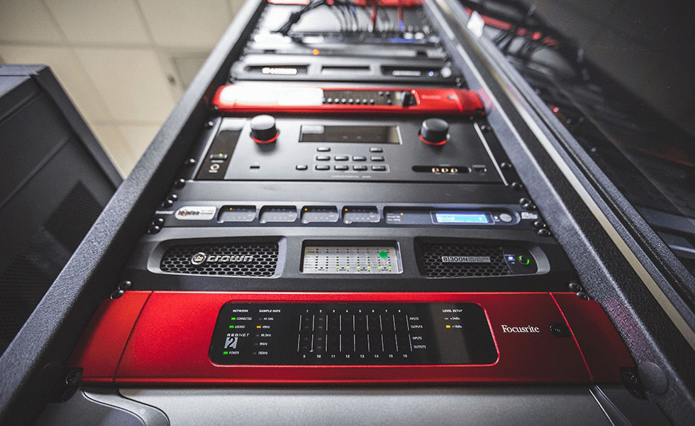 Photo caption 1: Focusrite RedNet components in a gear rack at Belmont University