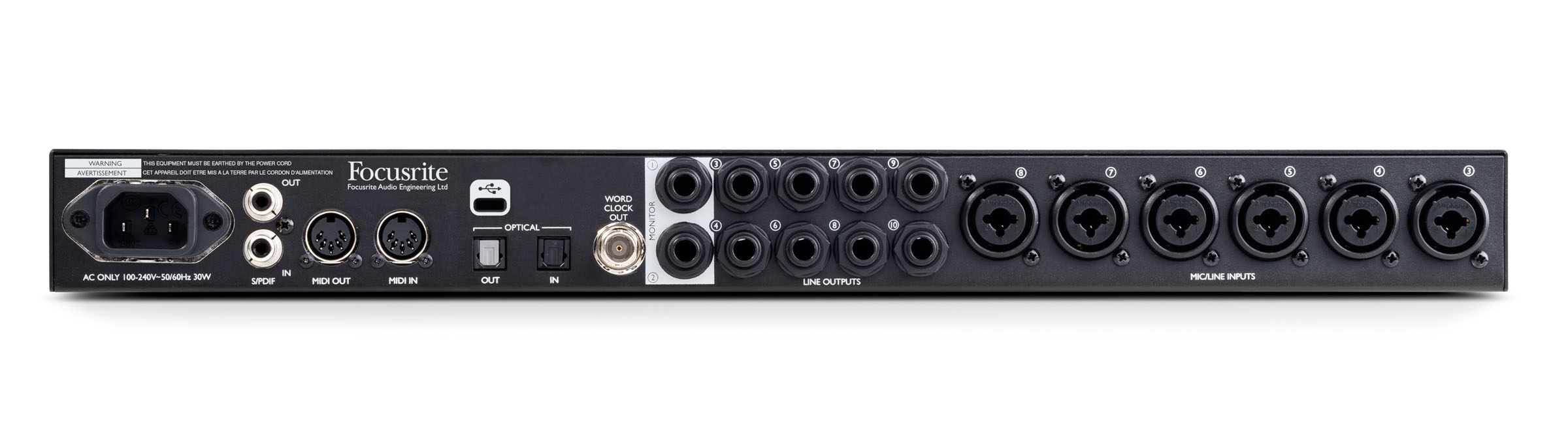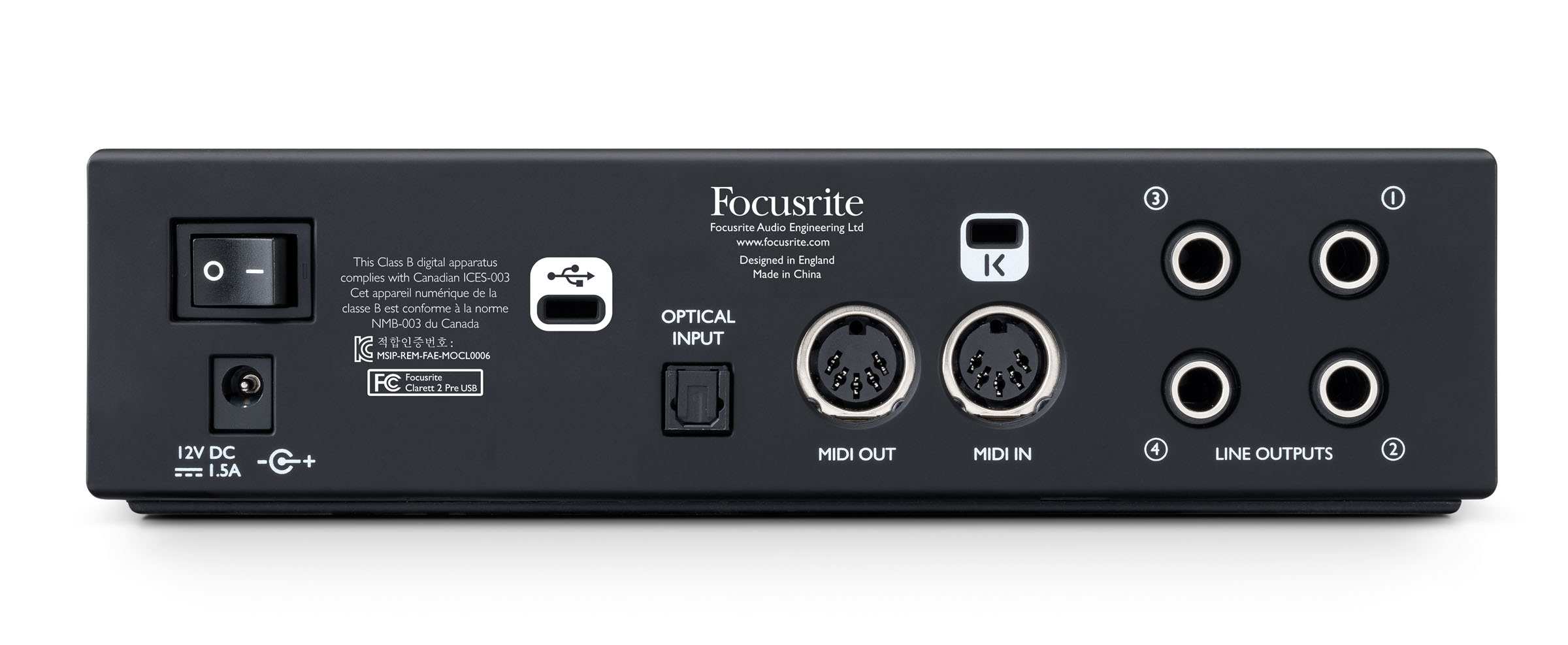 Photo caption 2: Focusrite Clarett 2Pre USB (10-in, 4-out), rear panel