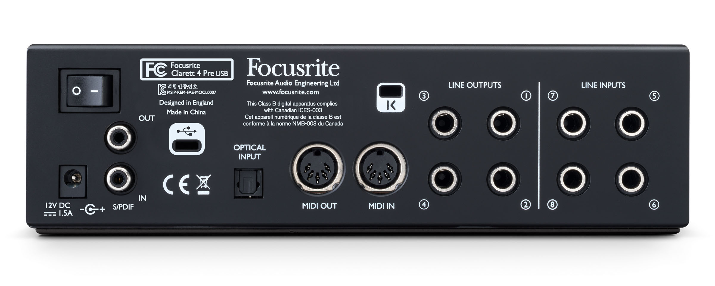 Photo caption 4: Focusrite Clarett 4Pre USB (18-in, 8-out), rear panel
