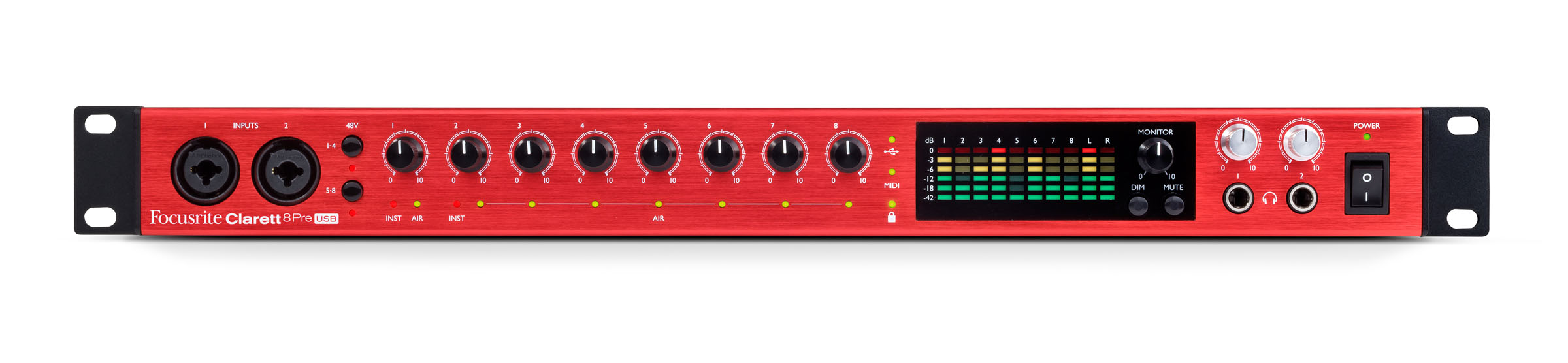 The simplest of the three interfaces, Clarett 2Pre USB, provides two mic/line/instrument inputs, four line outputs, MIDI I/O and an ADAT input. Clarett 4Pre USB and Clarett 8Pre USB add mic/line inputs, S/PDIF I/O and two headphone outputs with volume controls.