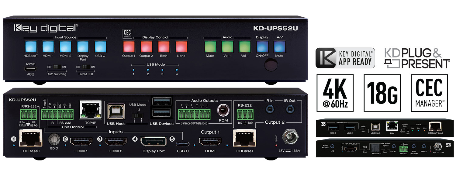 The system anchor is the KD-UPS52U Universal Presentation switcher featuring five inputs (HDBaseT, 2x HDMI, DP, USB-C), two mirrored outputs (HDBaseT, HDMI), LAN connectivity, audio de-embedding and ARC / eARC support. The Ultra HD/4K KD-UPS52U supports up to 4096x2160 or 3840x2160 24/25/30/60hz at 4:4:4 (up to 18Gbps bandwidth), offers life-like images through a wide range of luminance levels with HDR10 compatibility and deep color support up to UHD/4K 30Hz 4:4:4/12 bit or 60Hz 4:4:4/8 bit, includes a full buffer system to manage TMDS re-clocking / signal re-generation, is fully licensed and compatible with HDCP 2.2 and offers signal extension up to 100m / 328ft at 4K/UHD and up to 150m / 492ft at 1080p.