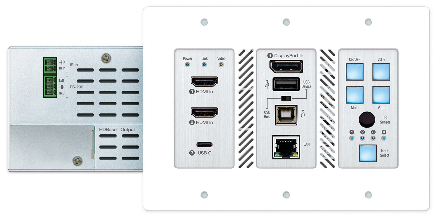 Tabletop or wall plate interface is accommodated by the KD-X4x1WUTx 4x1 4K/18G 100m HDBT PoH Wall Plate Switcher with 2xHDMI, DisplayPort, USB-B host and USB-C device connectivity, and IR, RS-232, IP and CEC Manager (Tx) control. For audio support, the compact KD-AMP220 offers 20 W x 2 bridgeable amplification, phantom-powered mic and two-channel line inputs with mixing, noise gate, volume and tone control, and remote control via IR and RS-232.