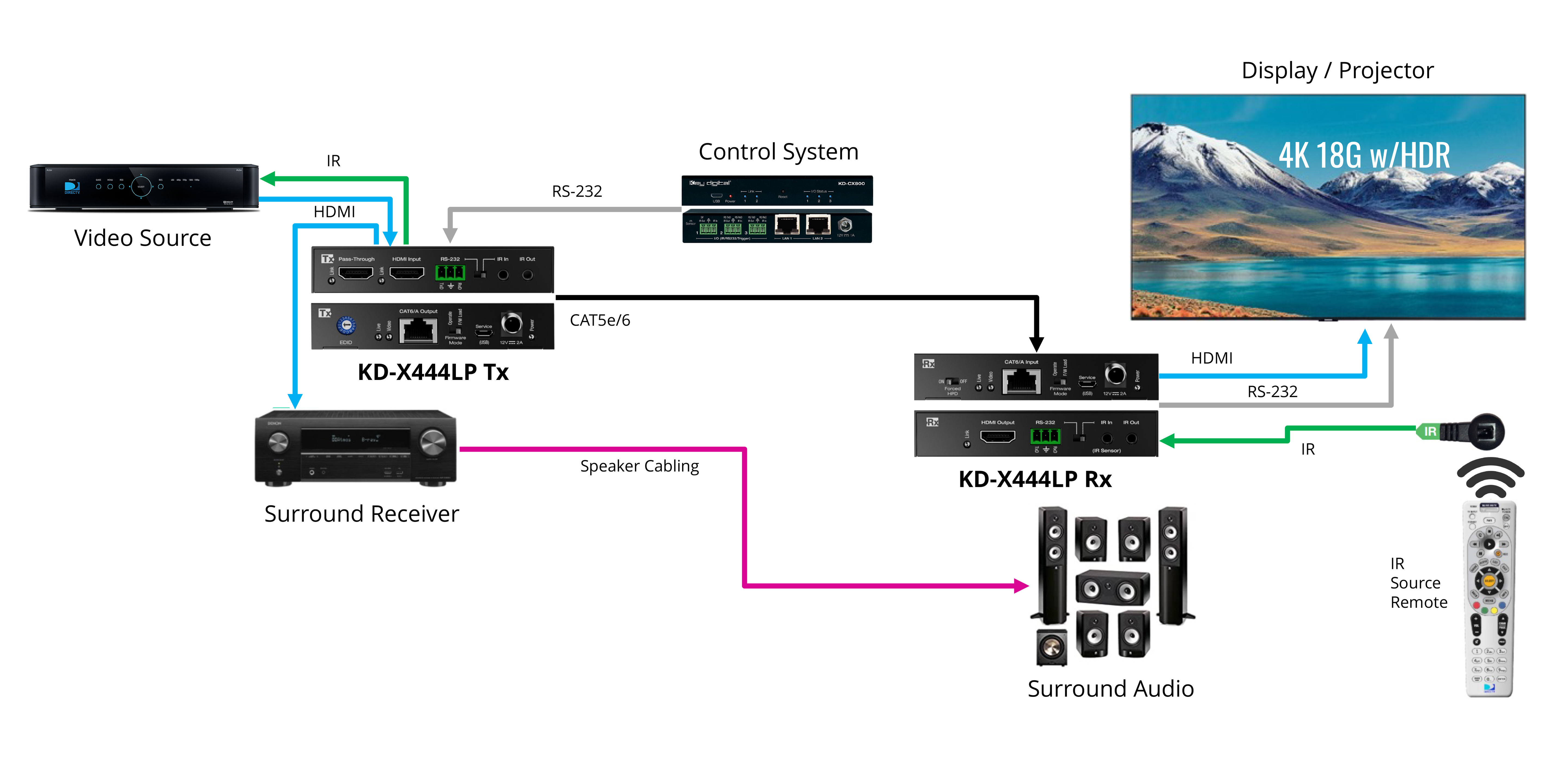 For shorter extensions of 50m (164ft) or less, and where 7.1 HD audio or HDMI pass thru is not required, Key Digital offers its otherwise identically capable KD-X444SP extender set.