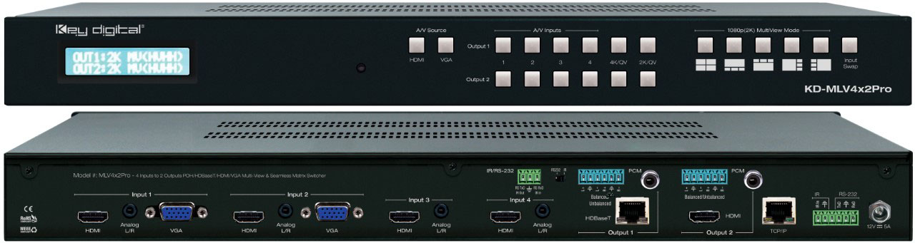 InfoComm, Orlando, FL, October 27, 2021 – Key Digital’s KD-MLV4x2Pro is an HDMI/VGA/HDBaseT seamless presentation matrix switcher and multi-view tiling processor and includes a KD-X222PORx HDBase T extender receiver with Power over HDBaseT.