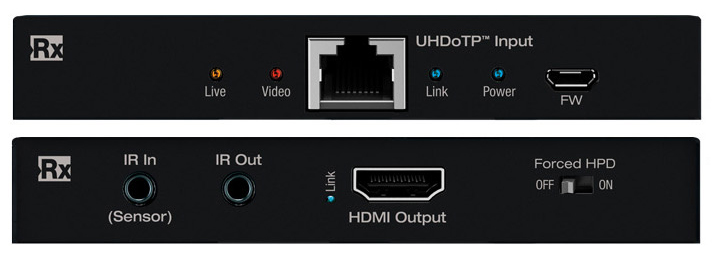 The KD-MLV4x4Pro natively accommodates 4K inputs and outputs, along with independently selectable output down-conversion to 1080P and 720P for support of legacy displays and projectors. The four HDMI outputs are mirrored to RJ45 ports for signal extension up to 40 meters (50 meters at 1080p) using Key Digital’s proprietary Ultra High Definition over Twisted Pair (UHDoTP) technology. The HDMI and UHDoTP outputs can be used simultaneously to feed up to eight displays. To feed displays at a distance, four KD-EXMLVRx UHDoTP receivers are included with the KD-MLV4x4Pro, with Power over CAT (PoC) to simplify installation wiring. Each receiver also incorporates an HDMI output as well as bi-directional IR remote support with repeater inputs for capture of remote signals for source control and repeater outputs for local control of displays.