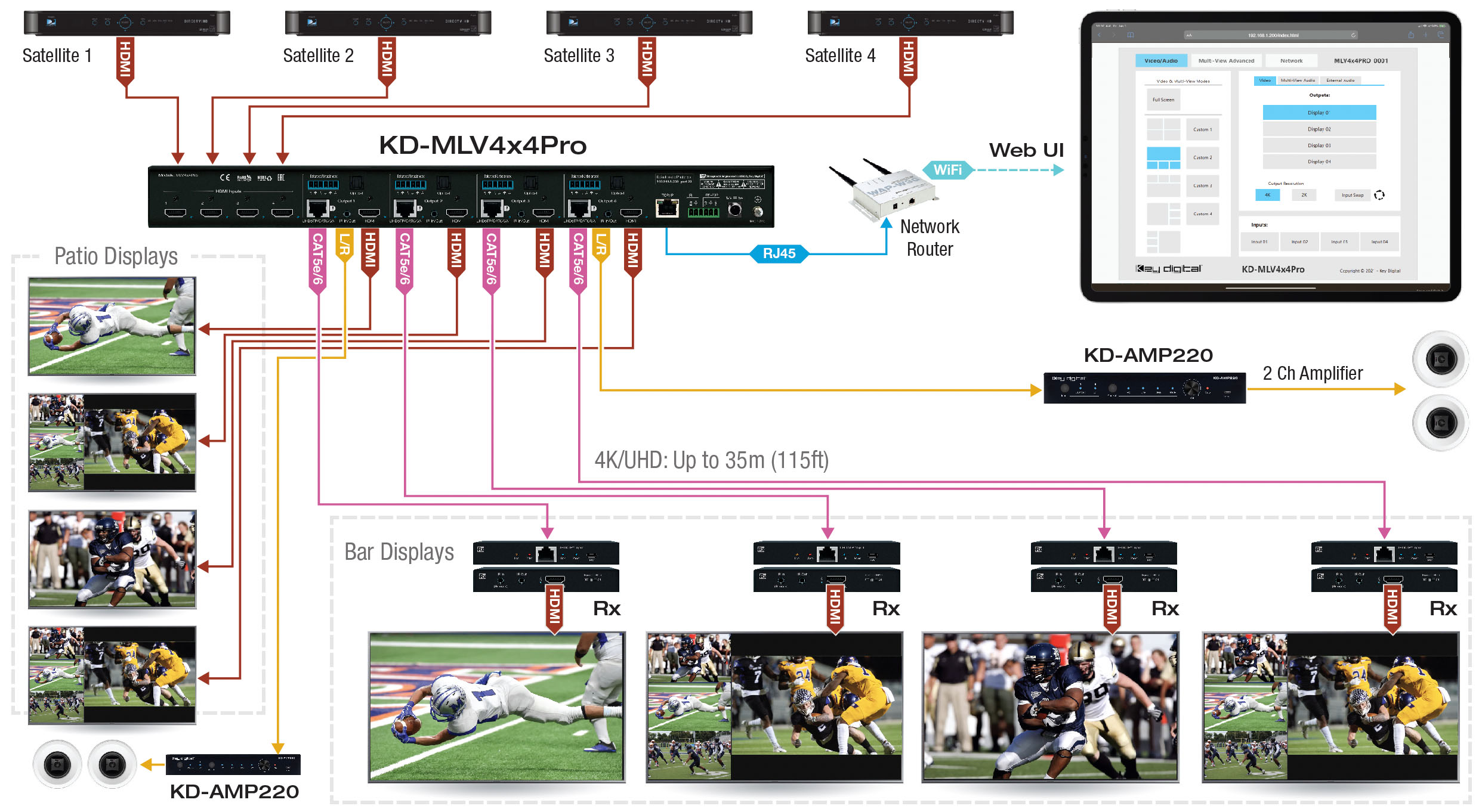The KD-MLV4x4Pro 4K UHD HDMI seamless matrix switcher is competitively priced at $2,950.00 MSRP and is available immediately.