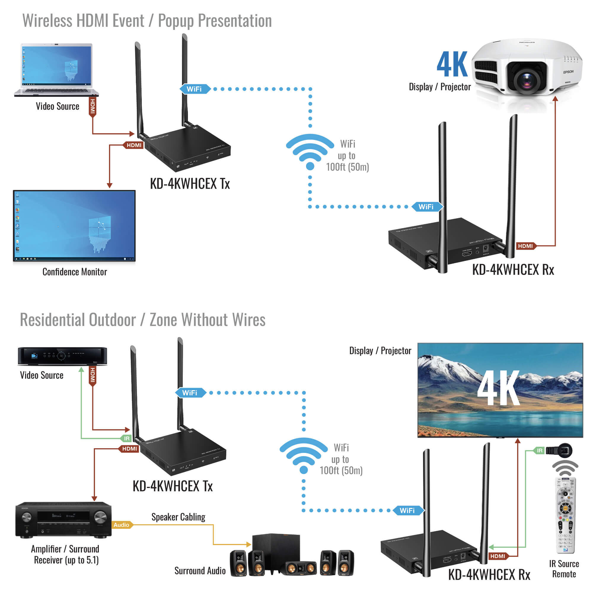 Use examples of the Key Digital KD-4KWHCEX wireless HDMI extender kit transmitter/receiver kit