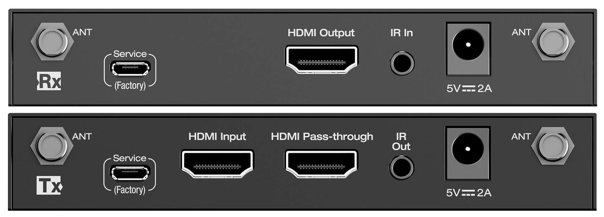 The rear panels of the KD-4KWHCEX wireless HDMI transmitter and receiver