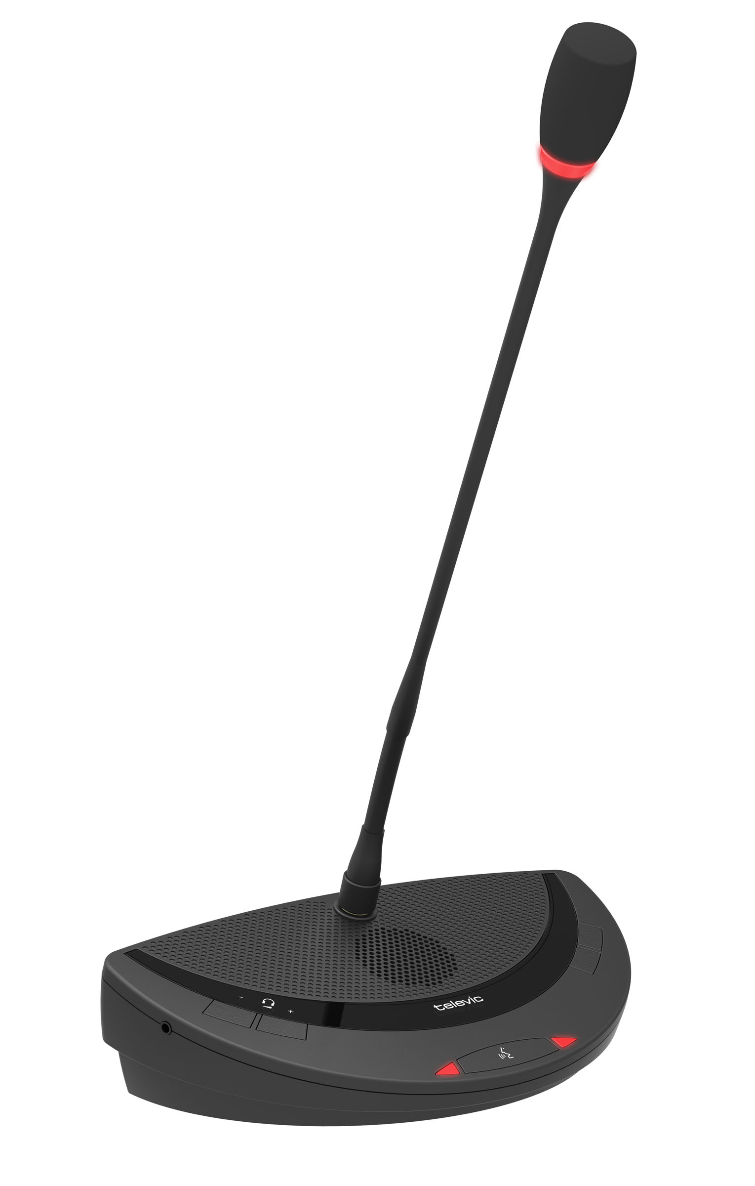 - Microphone On/Off or request-to-speak button with two signaling LEDs.
