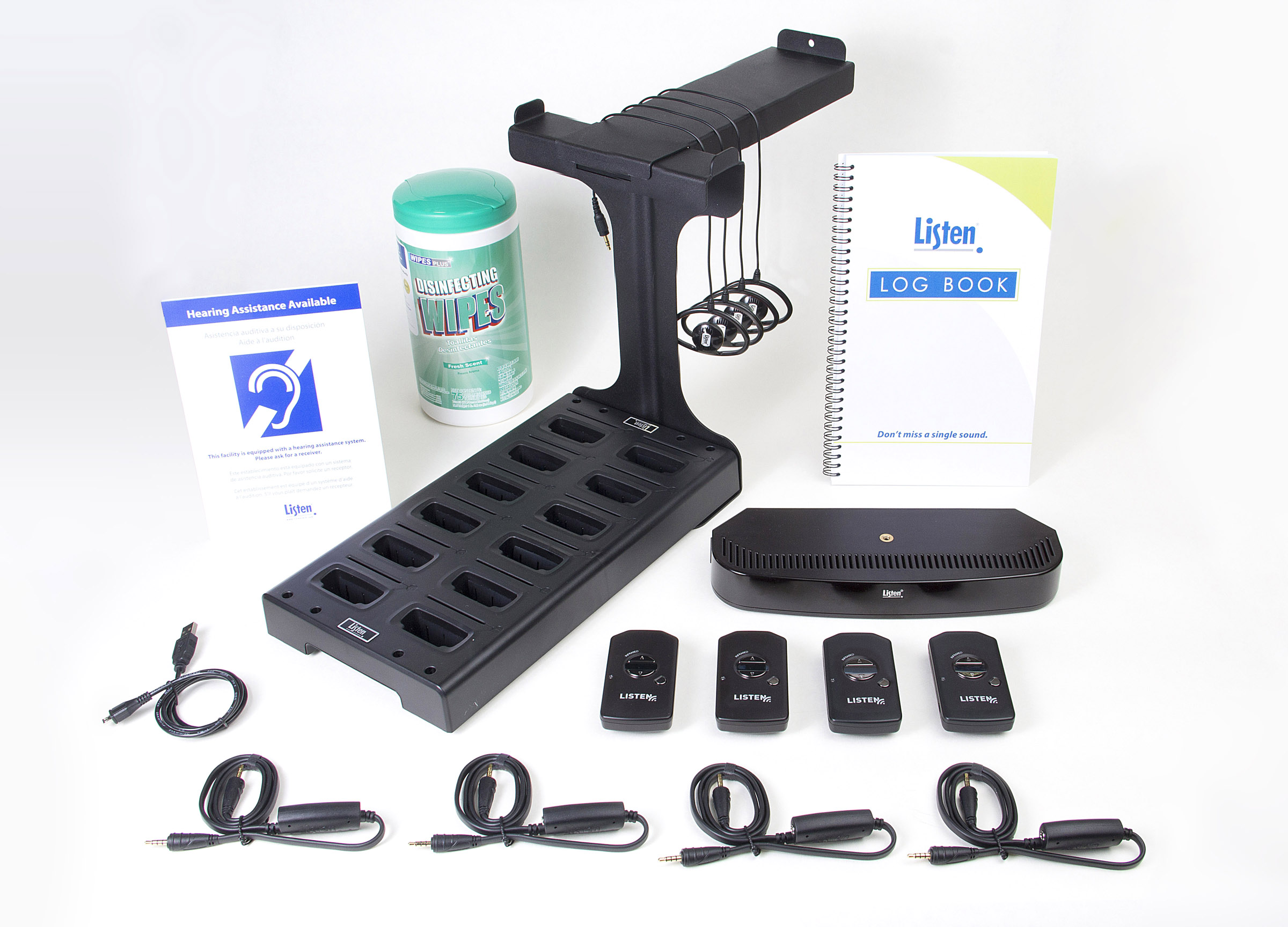 System components include the charging tray, which can be mounted in several ways; charging case; optional cable management system; earphones (with leatherette cushions, or hard plastic, solving certain sanitary issues); log book; free setup/inventory software; and signage. Two headphone jacks accommodate neck loop/lanyard or two sets of headphones (could be shared if needed).