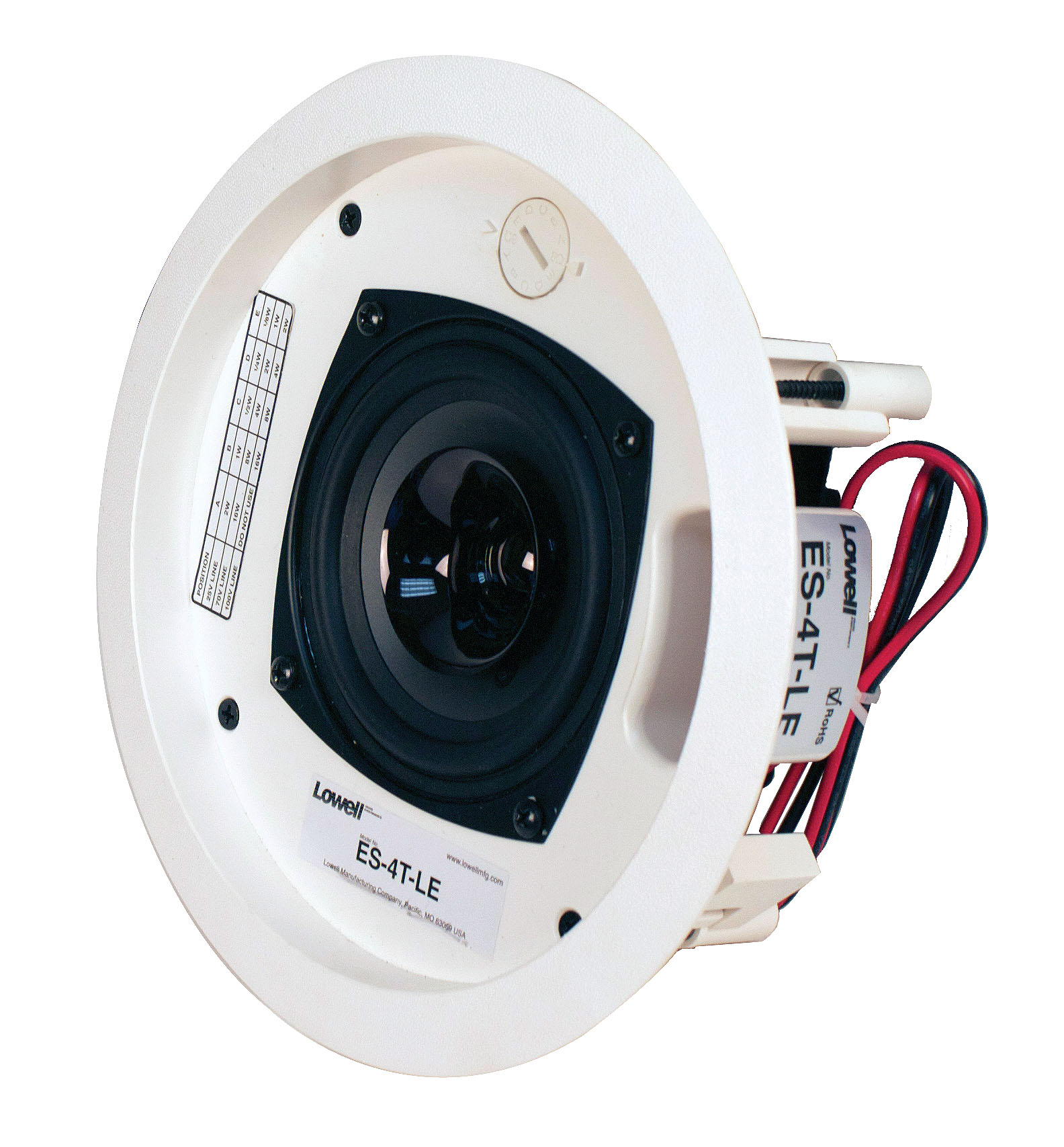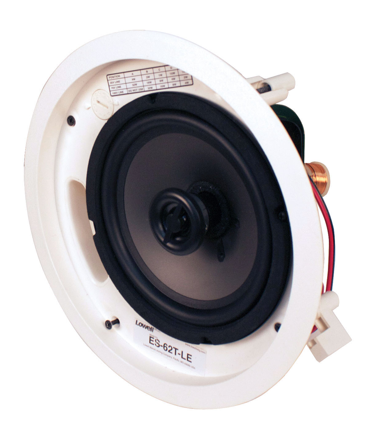 The ES-62T-LE and ES-4T-LE speakers are the same great performers as their non-LE cousins. The ES-62T-LE (with 6.5-inch coaxial driver) and ES-4T-LE (4-inch dual cone, full-range driver) produce excellent intelligibility for speech and full-frequency response for music, making them ideal for retail, commercial, industrial, institutional and residential applications. These recessed in-ceiling speaker systems provide the kind of crisp, high-frequency response that’s expected from high-quality speaker systems. The speakers’ wide dispersion can actually reduce the number of speakers required to produce even coverage in distributed speaker systems. Built-in reversible “dog-ear” mounting clamps aid fast installation, while allowing the speaker to be mounted in drywall, wood, tile or almost any type of ceiling with thickness up to 2.25 inches. The speakers can also be mounted to drywall or plaster ceilings for infinite-baffle applications (those without enclosures) using the integral dog-ears. Infinite-baffle installations; however, are not UL-listed. For these types of installations, users must order optional mounting components available from Lowell.
