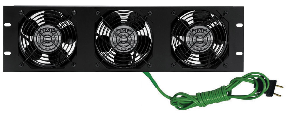 Each fan has a 4.7" diameter, 50 cfm airflow rating, 28 dB noise rating, and requires 5.5 Watts of power. Includes fan guards and power cord. Whisper fans are available in two formats: 19-inch E.I.A. Fan Panels, 3U (with 2 or 3 fans) or 7U (with 4 fans); as well as a single fan kit for spot cooling.