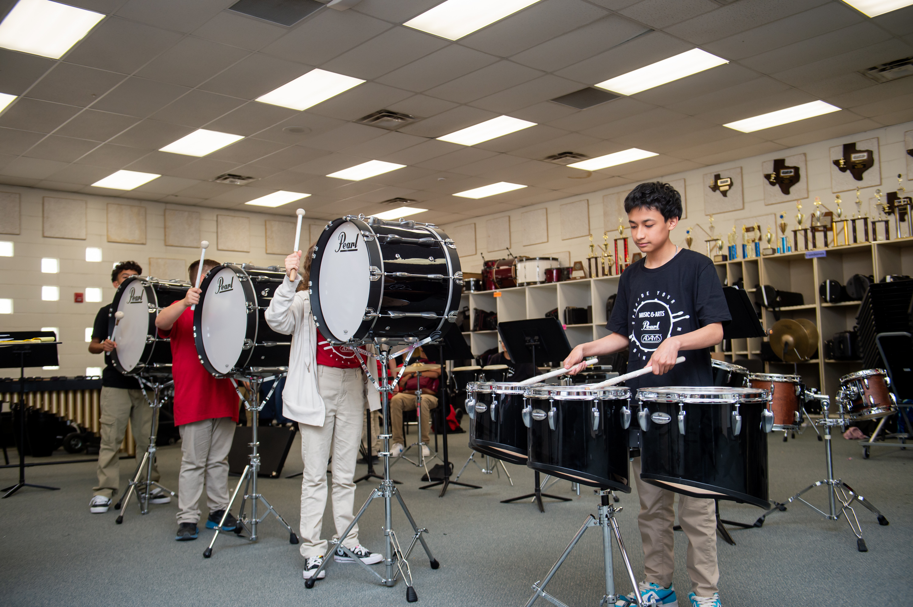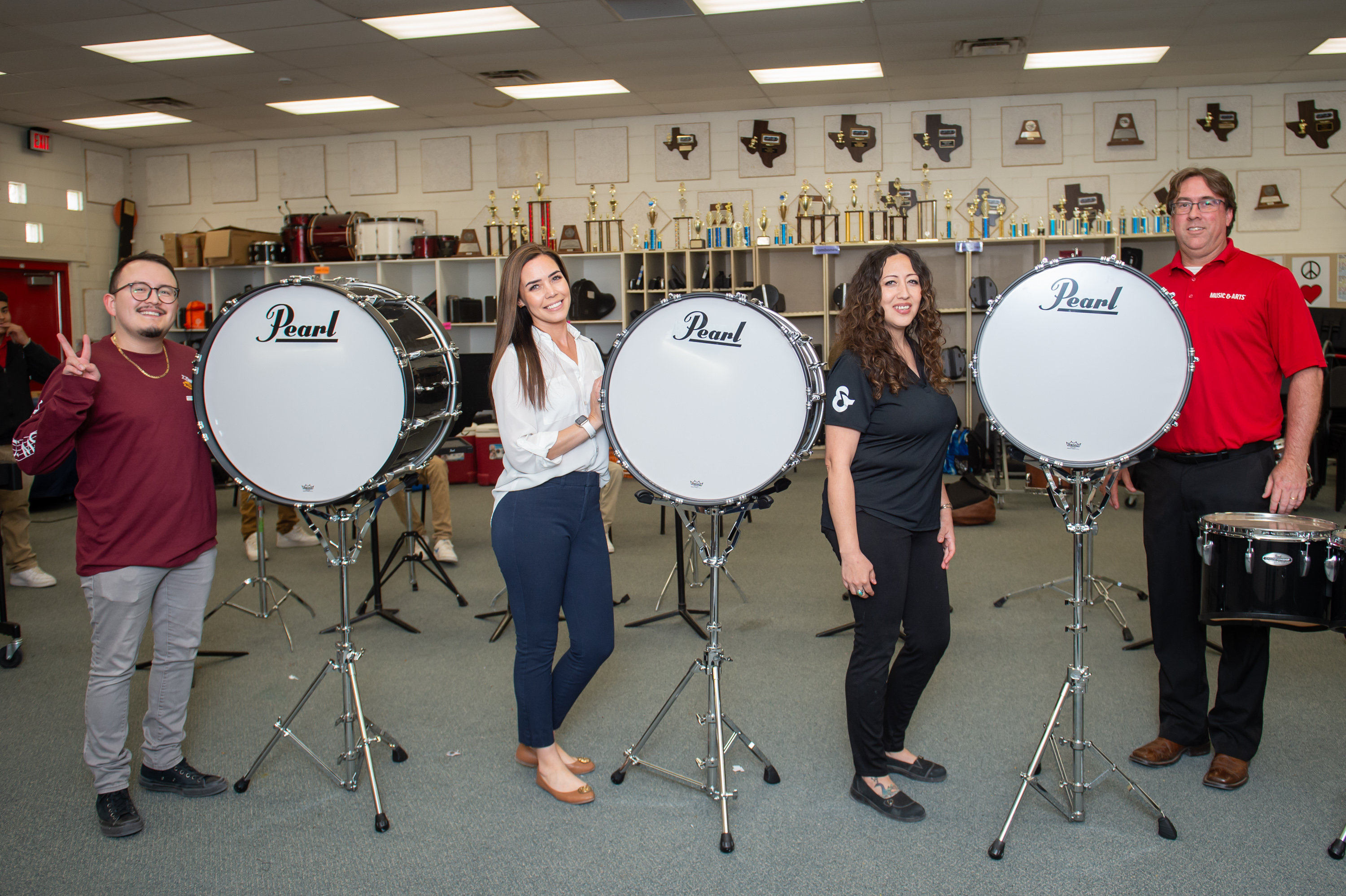 Photo caption: Students trying out their new Pearl marching bass drums at Col. John O. Ensor Middle School in Horizon City, TX.