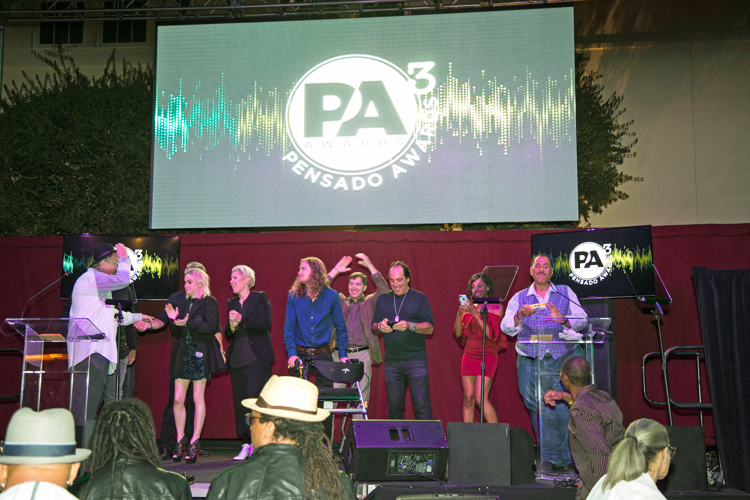 An assemblage of co-hosts, presenters and honorees on stage at the grand finale of the third annual Pensado Awards, Saturday, August 20, 2016, at Sony Pictures Studios in Culver City, CA. At center is David Platillero, a talented young producer-engineer who suffered a severe injury earlier this year while enrolled at the Blackbird Academy. The evening’s festivities raised funds for his ongoing rehabilitation. Photo by Chris Schmitt Photography. © 2016.