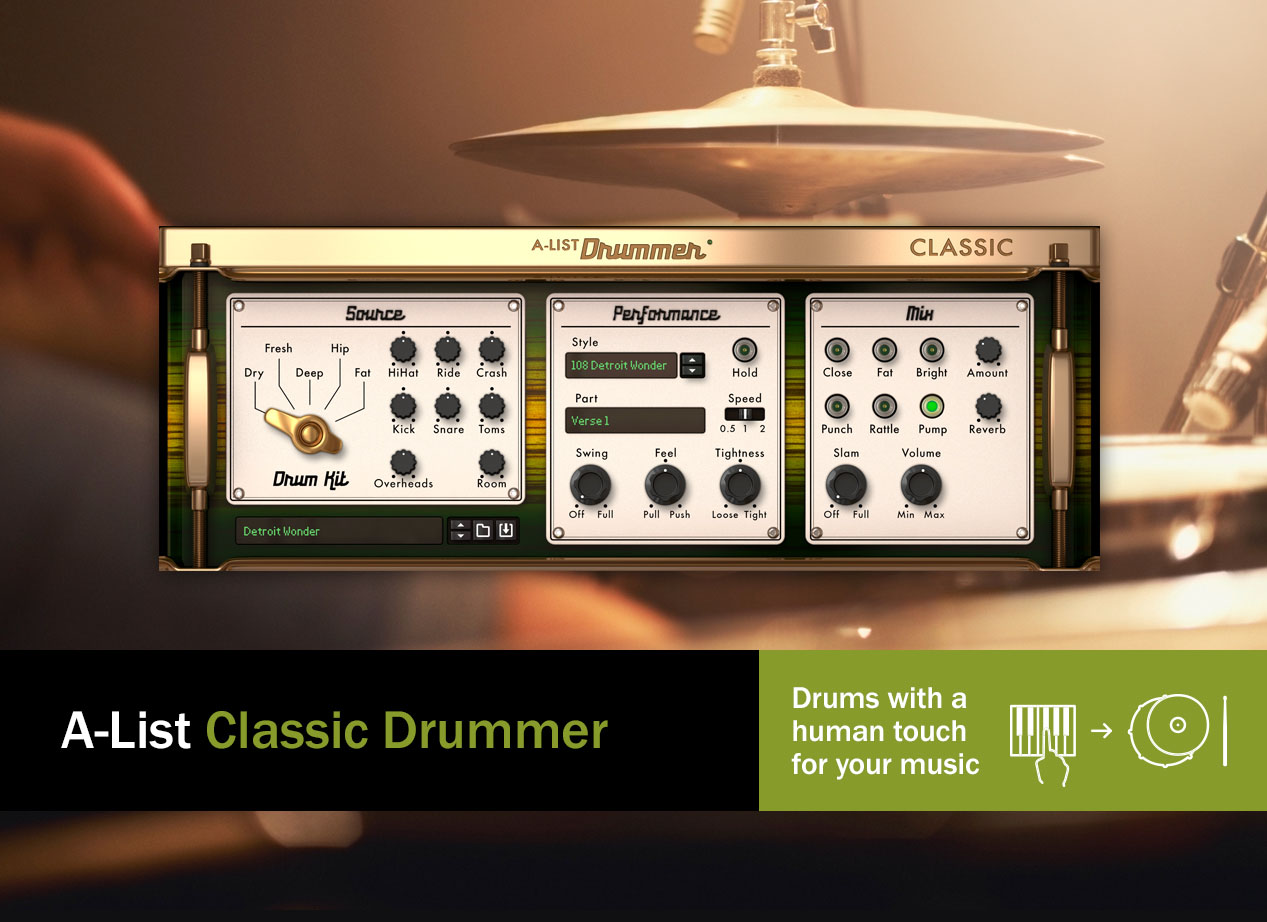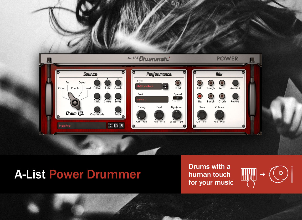 Each new A-List Drummer instrument combines the living, breathing performance of a top-notch session drummer with the sonic versatility and competence of a professional engineer in a world-class recording studio. Play, combine and tweak a virtually endless array of drum patterns in real time to create unique, realistic and inspiring performances.