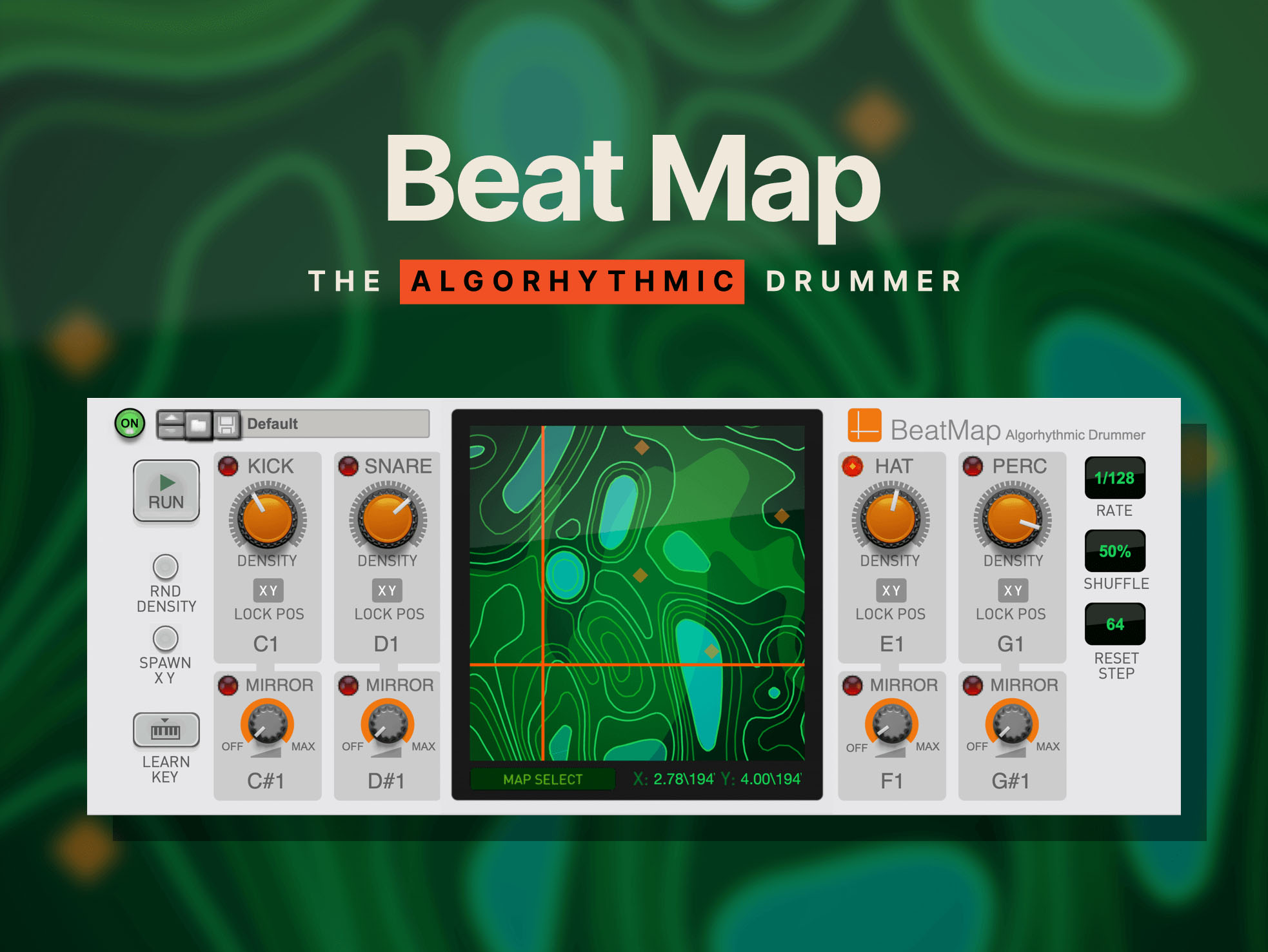 Beat Map is a Reason Player (also called a MIDI effect) that can trigger sounds from any external drum machine or synthesizer. The interface features four channels – one each for the kick, snare, hi-hats and percussion – as well as an intuitive central X-Y pad. Changing a beat is as simple as dragging the crosshairs around the map or turning one of the knobs to adjust the density of individual elements of a drum groove.