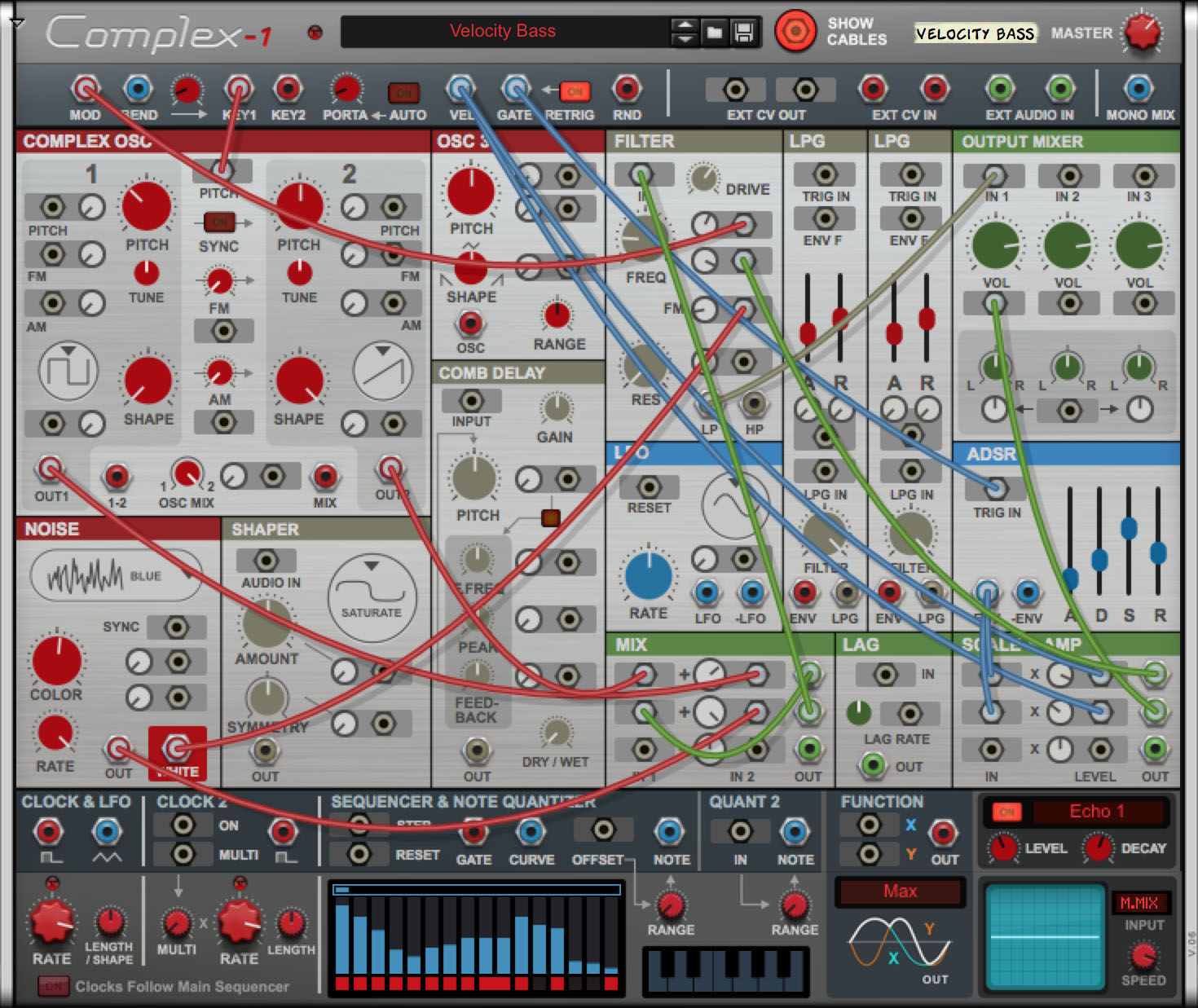 Photo caption 2: User interface for Complex-1, a modular synthesizer plugin for Reason (with cables shown).