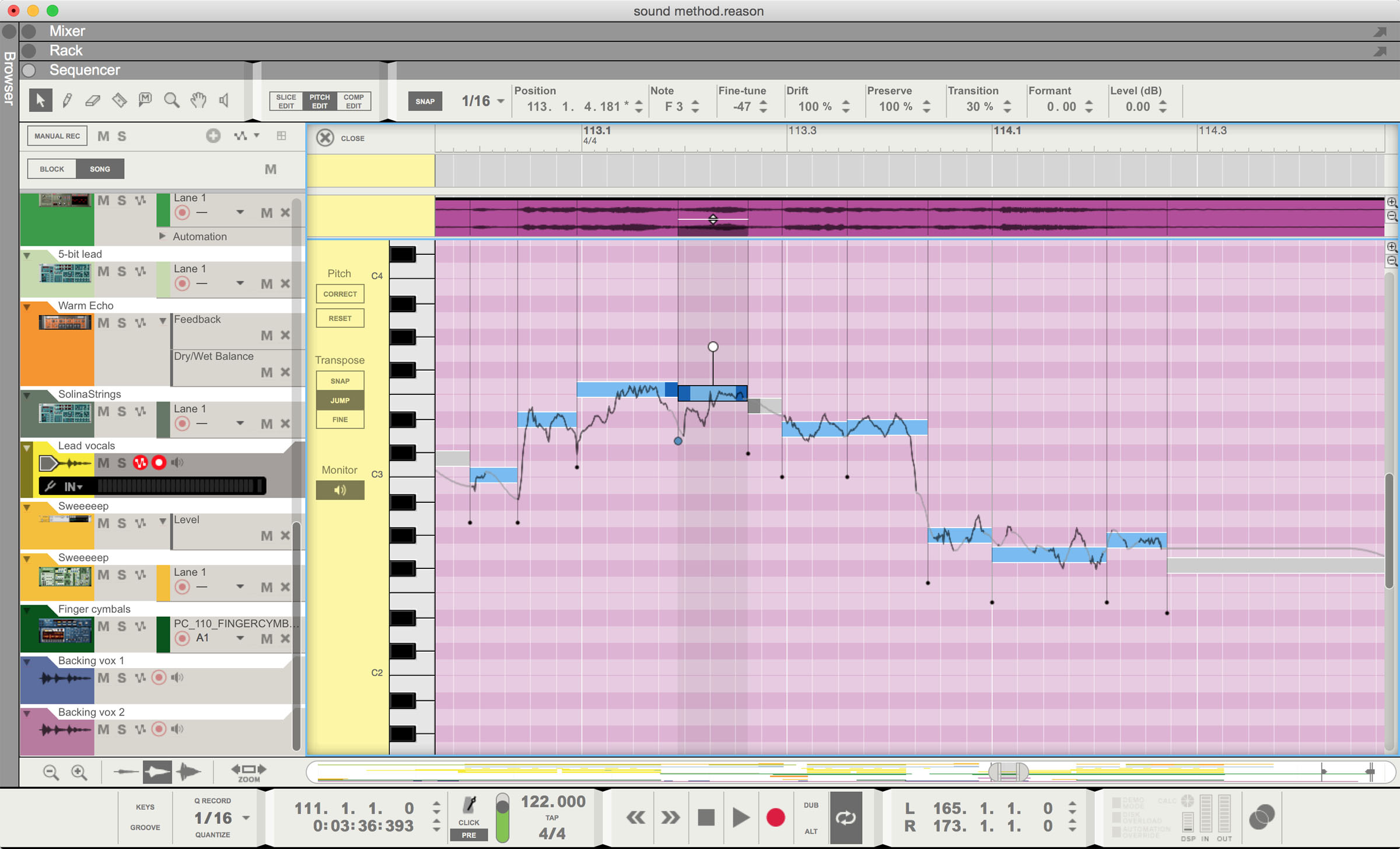 Reason’s new Pitch Edit mode helps you produce flawless vocals. Fix out-of-tune notes, add vibrato, change your timing, create new melodies from your recording, change the dynamics, and more. Audio to MIDI lets you convert your vocals to MIDI notes for endless sound manipulation possibilities.