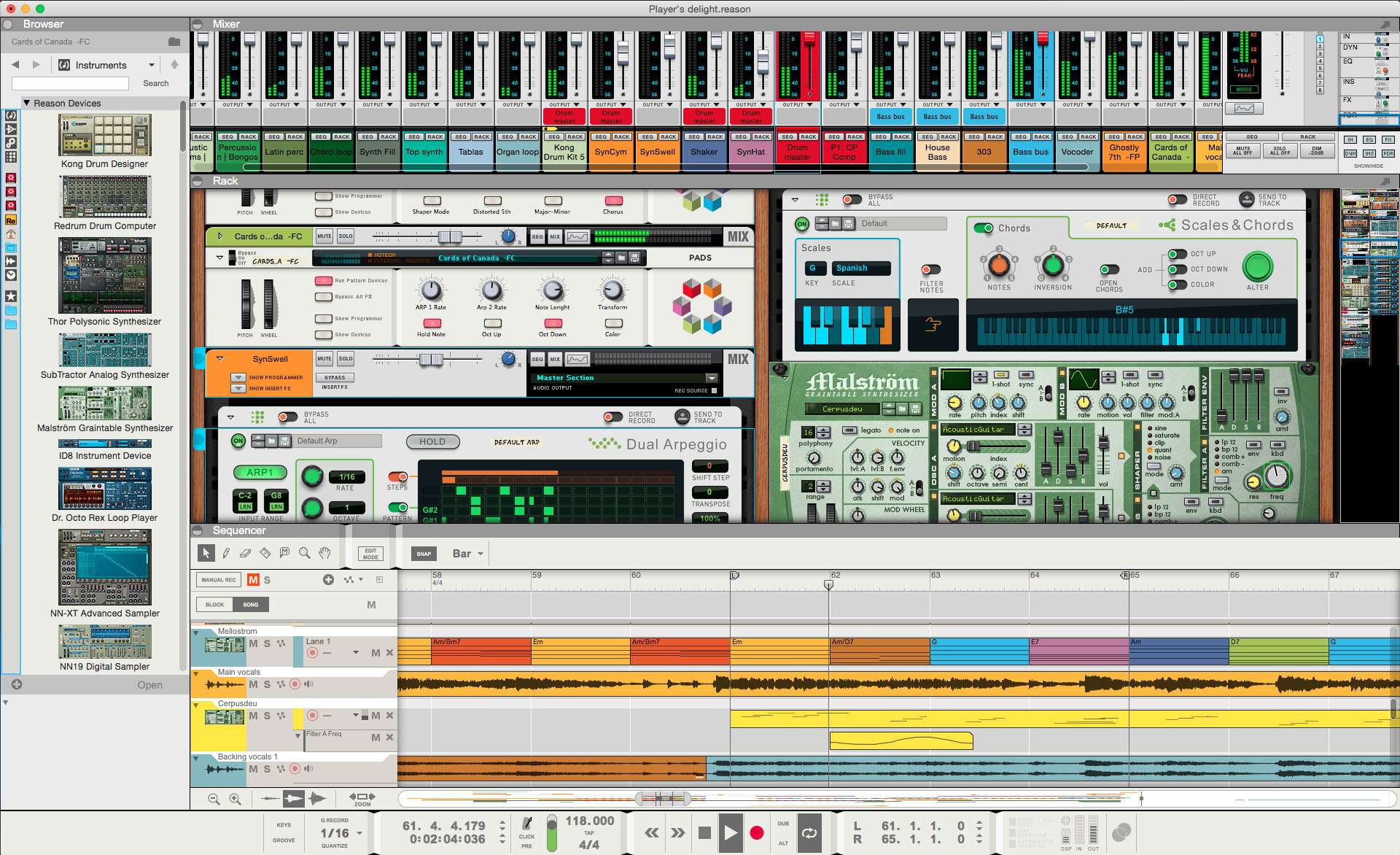 Reason 9 introduces three Player devices that instantly transform any MIDI input into compelling music. Note Echo creates rhythmic, pitched MIDI delays for melodies, drum rolls, and more. Scales & Chords turns simple melodies into beautiful harmonies and chords so you can stay focused on the music making. Transpose notes to a selected scale and automatically generate chords for your song, no music theory required. Dual Arpeggio transforms chords into intricate and inspiring rhythms. From classic up-and-down to polyphonic and polyrhythmic, Dual Arpeggio breathes new life into any instrument in your Reason rack.