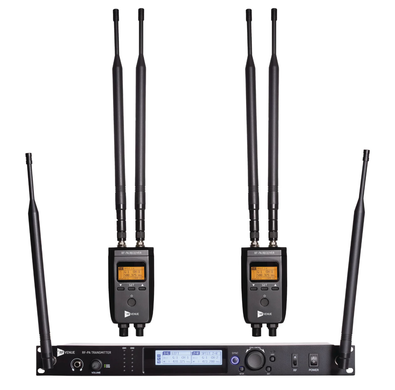Composed of one rack-mount two-channel transmitter and two compact single-channel portable receivers, the RF PA Extension Kit extends two channels of high-quality audio wirelessly via analog FM in the 470 to 506 MHz UHF band. The 1RU transmitter independently accepts two line-level analog input channels and transmits separate RF signals. Hardwired audio pass-throughs leave the primary signal path unchanged.