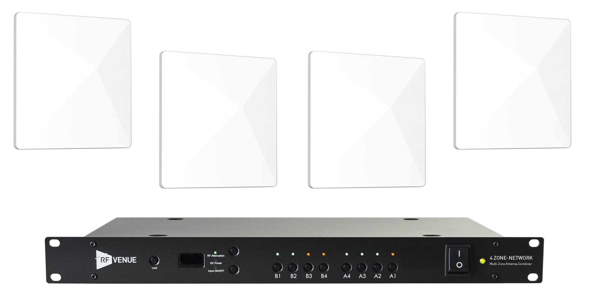 Photo caption 4: 4 ZONE-Network is available as a standalone unit or in a bundle with four RF Venue Diversity Architectural Antennas