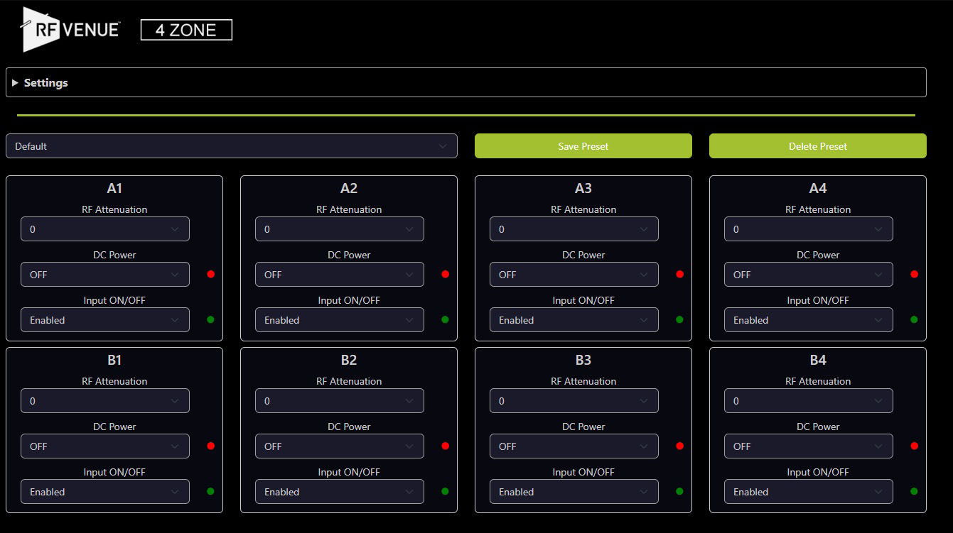 The 4 ZONE-Network integrates a built-in browser-based interface that allows users to make configuration changes from any PC, tablet or phone. This feature significantly speeds up setup and simplifies adjustments both before and during live events. The 4 ZONE-Network’s remote control capabilities include zone management, allowing users to toggle antennas on or off across up to 4 independent zones. Additionally, RF performance optimization by way of remote attenuation adjustment and remote toggling of 12 VDC power to active antennas and inline amplifiers is available on a per-channel basis. Workflow efficiency and flexibility are enhanced by the ability to store and recall presets for repeatable setups and faster changeovers.