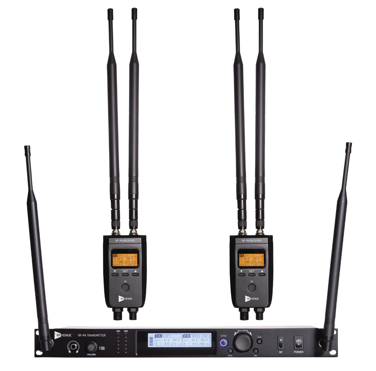 The RF PA Extension Kit is composed of one rack-mount transmitter and two compact receivers; the kit extends two channels of high-quality audio wirelessly via analog FM in the 470 to 506 megahertz UHF band – outside the crowded RF bands conventionally used for wireless microphones and monitors. The system functions much like a miniature radio station – one transmitter can feed unlimited receivers with no interference between them.
