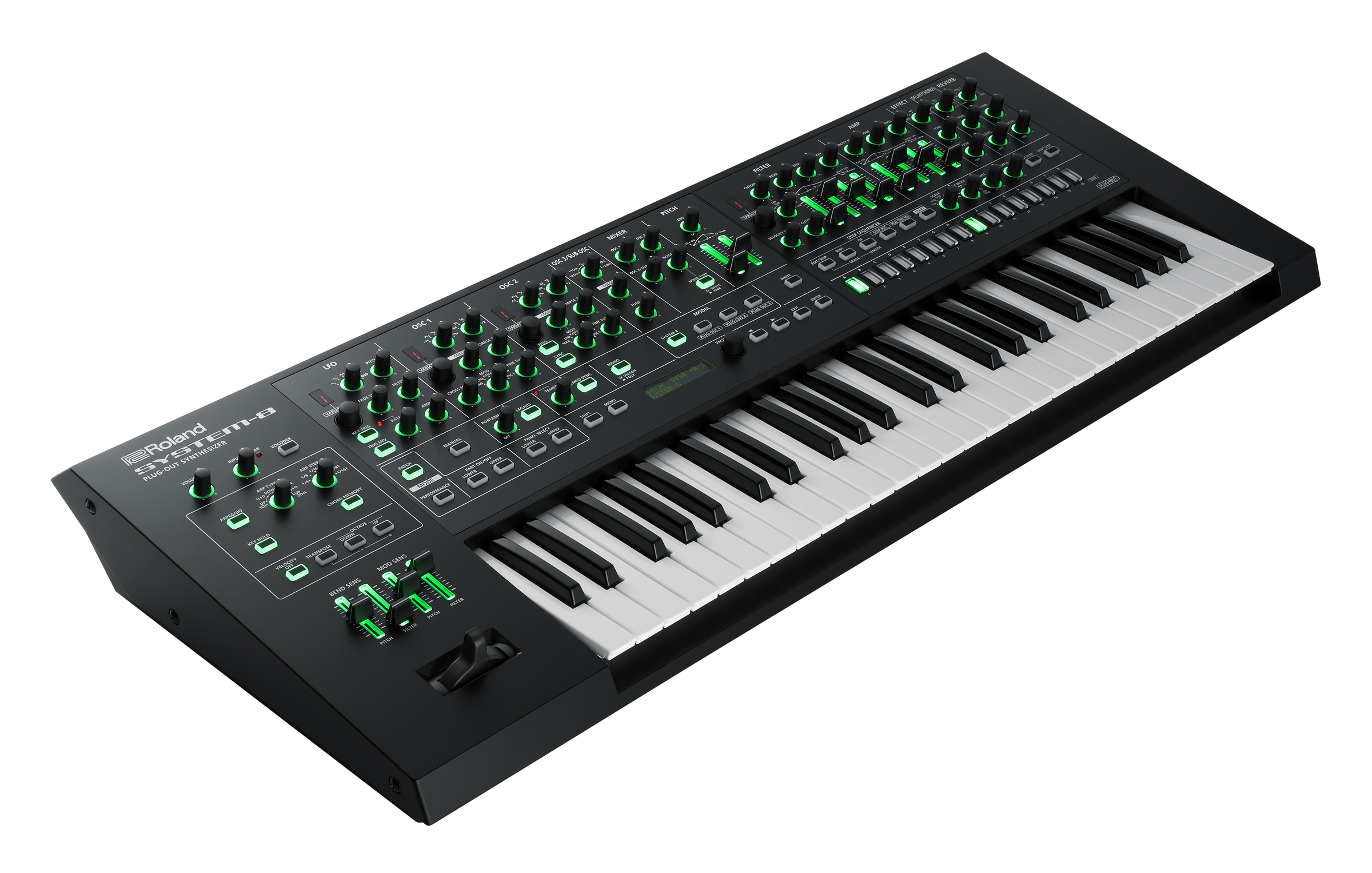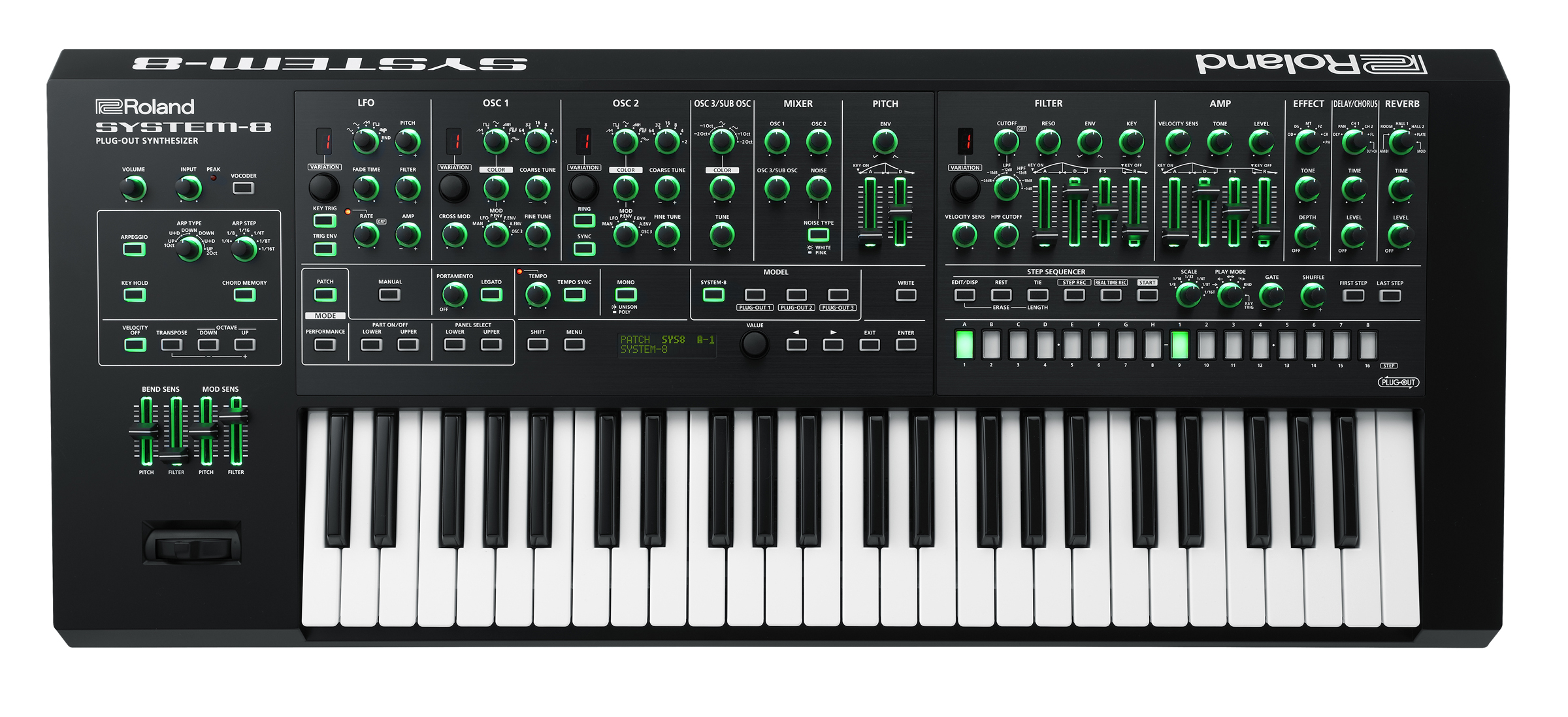 September 9, 2016, Los Angeles, CA — Roland has released the SYSTEM-8 PLUG-OUT Synthesizer, an advanced performance instrument that features the latest generation of the acclaimed Analog Circuit Behavior (ACB) technology. Powerful and deep, the SYSTEM-8 delivers a wide range of sounds inspired by over four decades of legendary Roland synths. To complement its internal sound engine, the SYSTEM-8 can host and control up to three Roland PLUG-OUT software synthesizers, and new JUPITER-8 and JUNO-106 PLUG-OUTs are included with purchase. The synth also includes a massive array of hands-on controls, as well as a polyphonic step sequencer, vocoder, CV/GATE outputs, arpeggiator, and other creative tools.