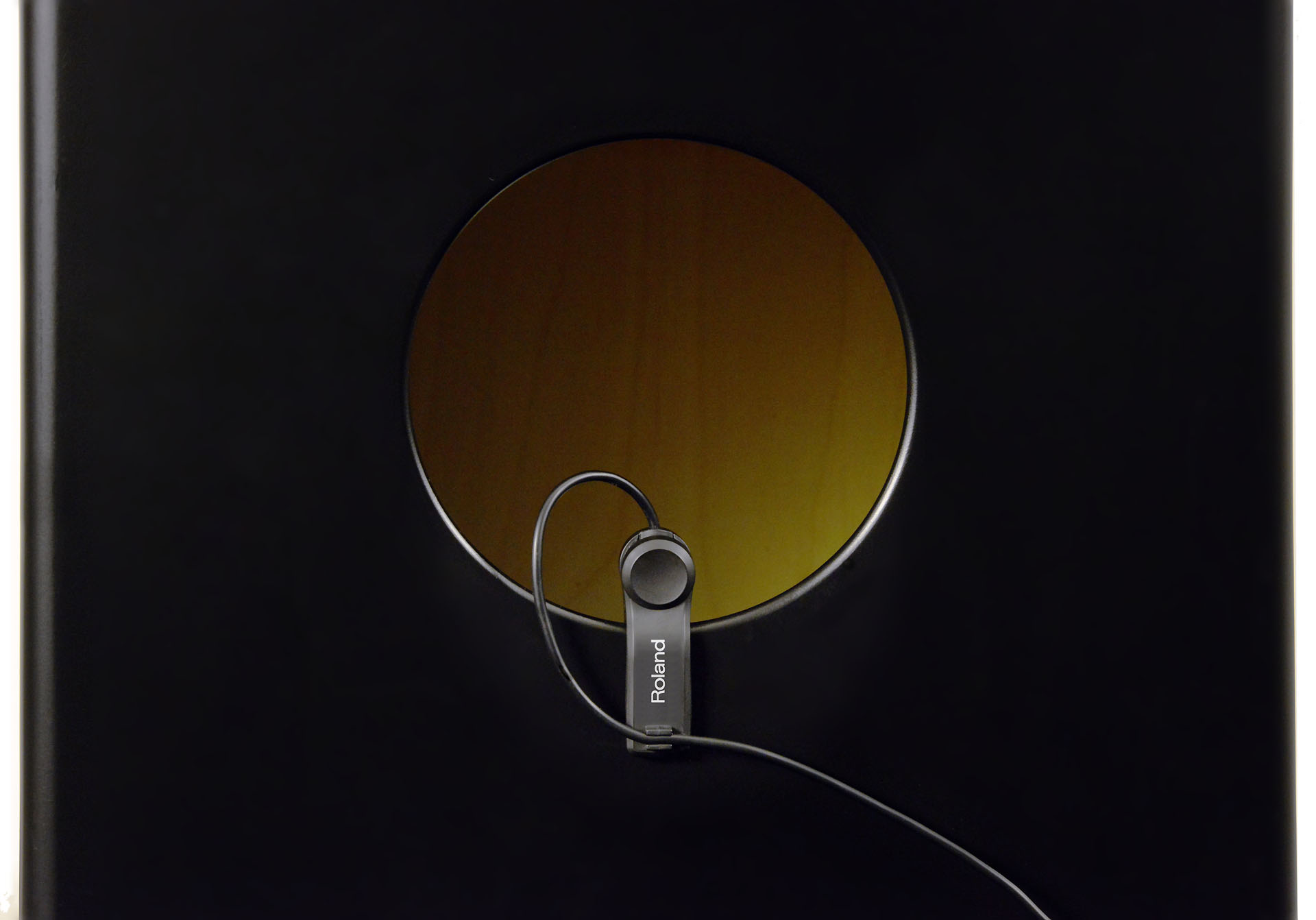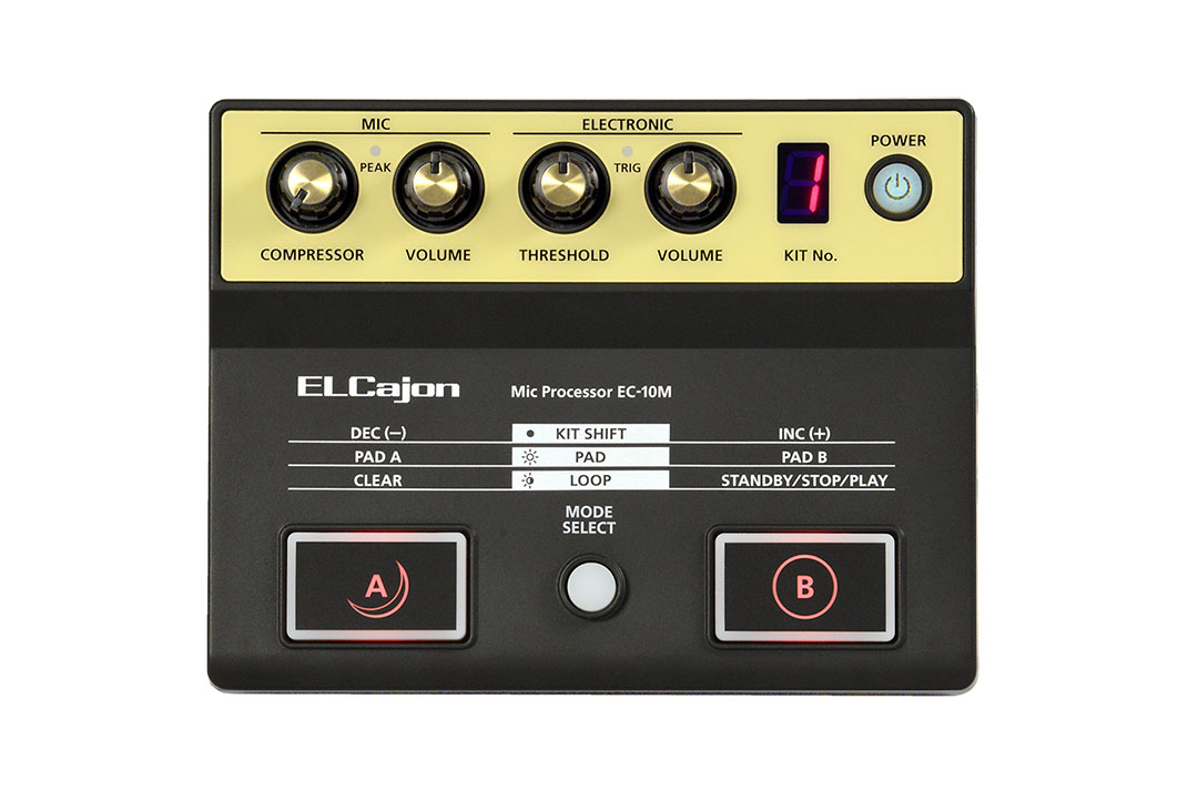 The EC-10M contains a wide selection of electronic percussive sounds such as snare drums, cymbals, and tambourines that can be triggered by everyday objects via the included clip-on mic, turning any object into a percussive instrument. Musicians can clip the mic onto the soundhole of an acoustic cajon to enhance their performance, or on the soundhole of an acoustic guitar to accompany themselves with percussive rhythms. Players can also amplify their instrument by using the EC-10M as a preamp and sending the signal to an amp or PA system.