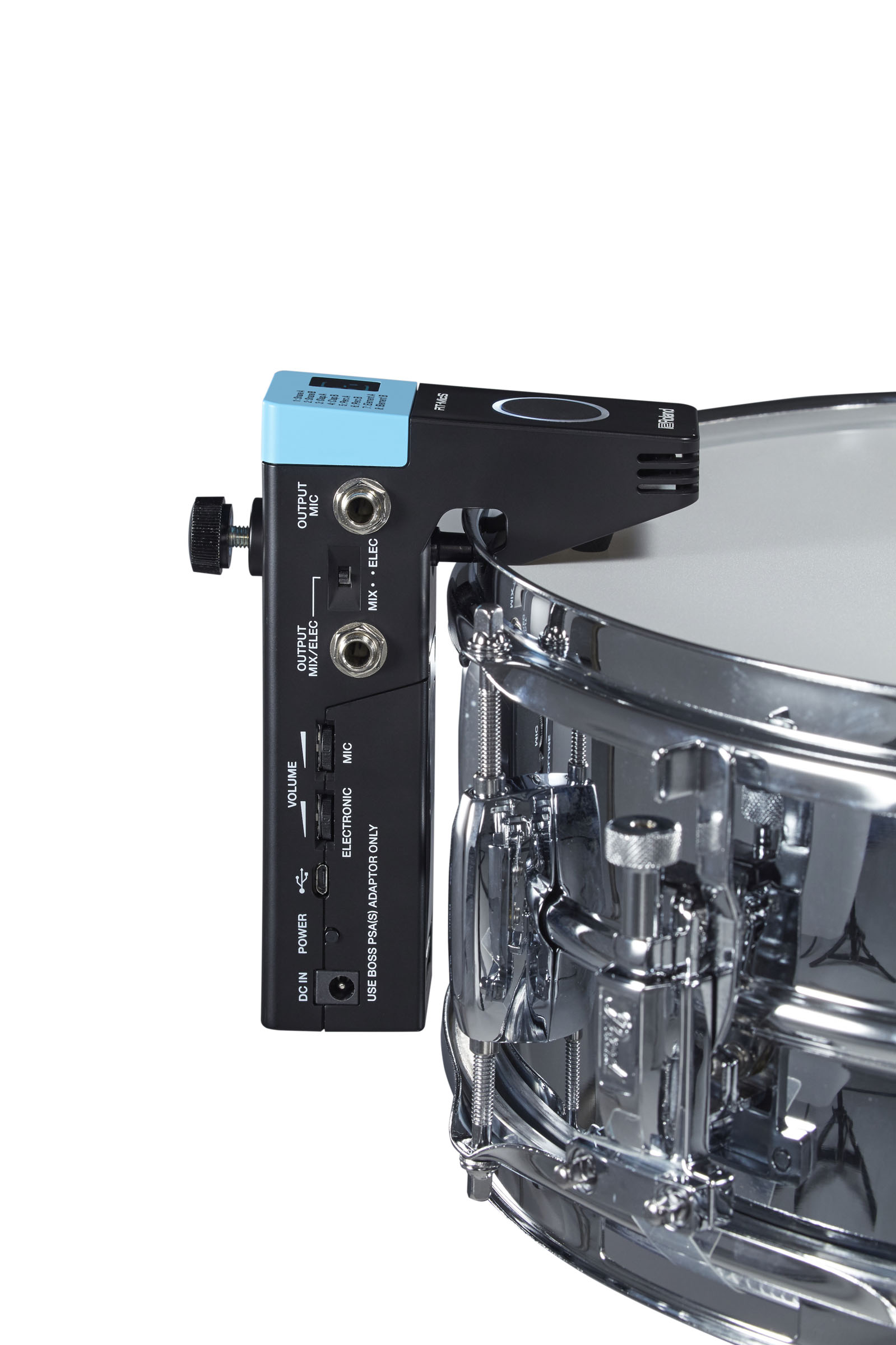 With its integrated microphone, the RT-MicS allows the user to amplify their acoustic snare or tom sound through a PA without having to use a separate mic. Individual quarter-inch outputs are provided for the mic and electronic sounds, and it’s also possible to blend the two sounds inside the RT-MicS and send them to a single output.