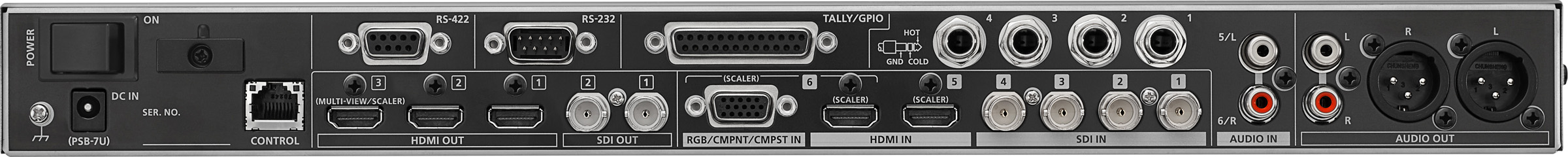 An RS-422 port provides PTZ control (VISCA) along with an RS-232 connector for remote control from a touch panel or other programmable interface device. A USB port is included for still image uploads and for saving program files.
