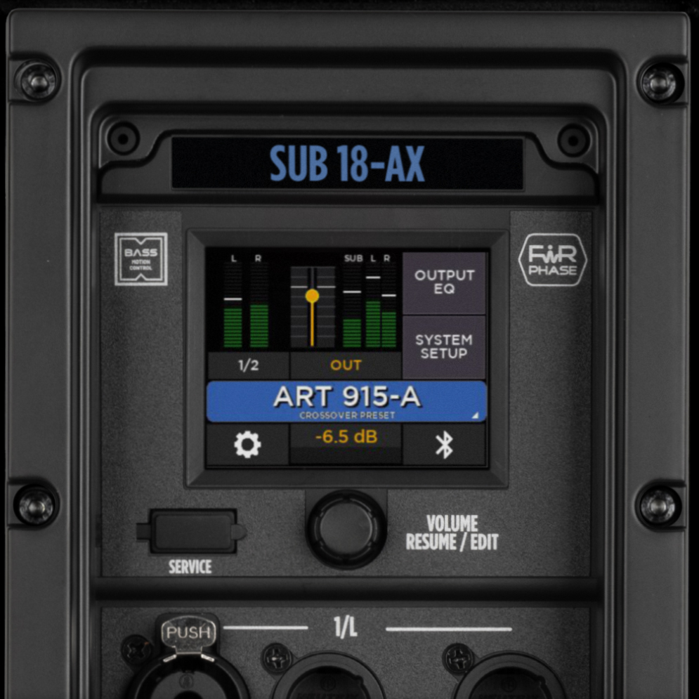 The SUB 18-AX is a portable professional 18-inch high-power active subwoofer for live sound applications with fully featured processing (including dual crossovers, 8-band EQs, routing, delays, cardioid configurations, and recallable crossover presets and eight snapshots plus RCF’s advanced, proprietary FiRPHASE linear phase and BMC excursion management algorithms), a large 2.4-inch color touch panel and rotary push controller. The RCF LiveRemote App for iOS and Android delivers remote control via Bluetooth. The combination of a latest-generation transducer with a powerful 2200 W Class-D amplifier delivers sound pressure levels up to 135 dB with exceptional clarity and headroom. The SUB 18-AX’a polyurea-coated all-wood bass reflex cabinet features a sealed Powercon True1 Top connector. I/O also includes a dual XLR/TRS combo input + link and dual XLR crossover outputs.