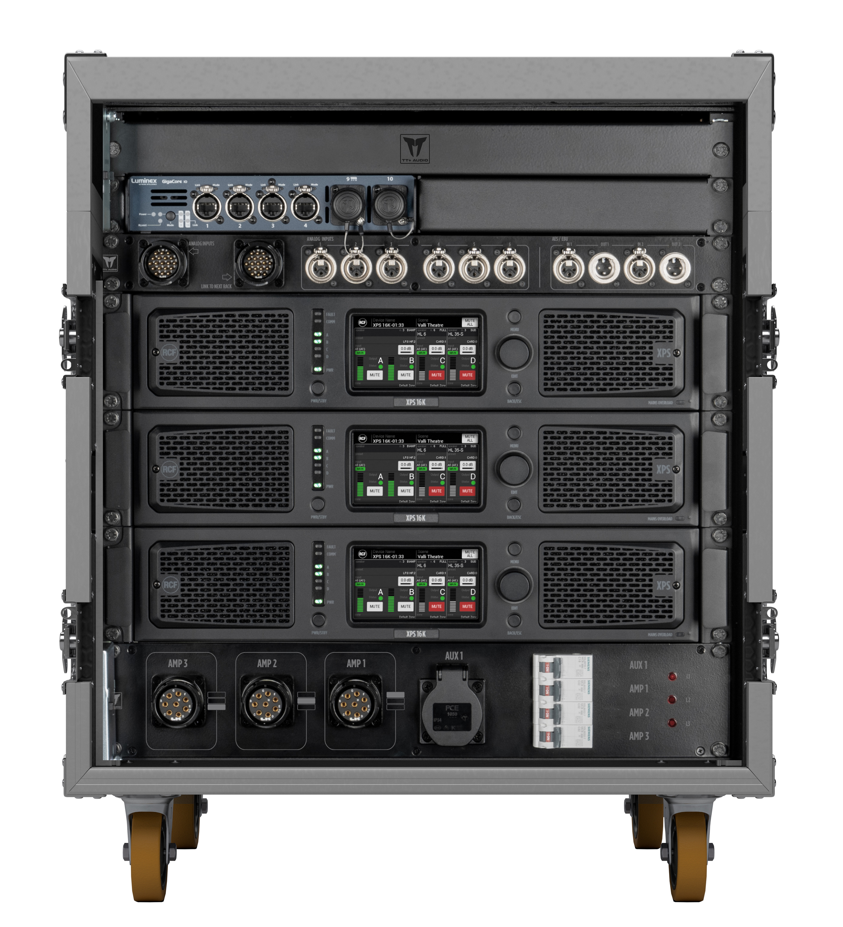 Each 11 RU touring rack can accommodate up to three XPS 16K 4-channel DSP amplifiers and includes AC power, signal routing, and network connections. A single XPS 16K amplifier, delivering four channels, powers every four GTX 10 modules. A single TTR 16K touring rack can power a complete 6+6 GTX 10 system with four GTS 29 double 19-inch subwoofers.